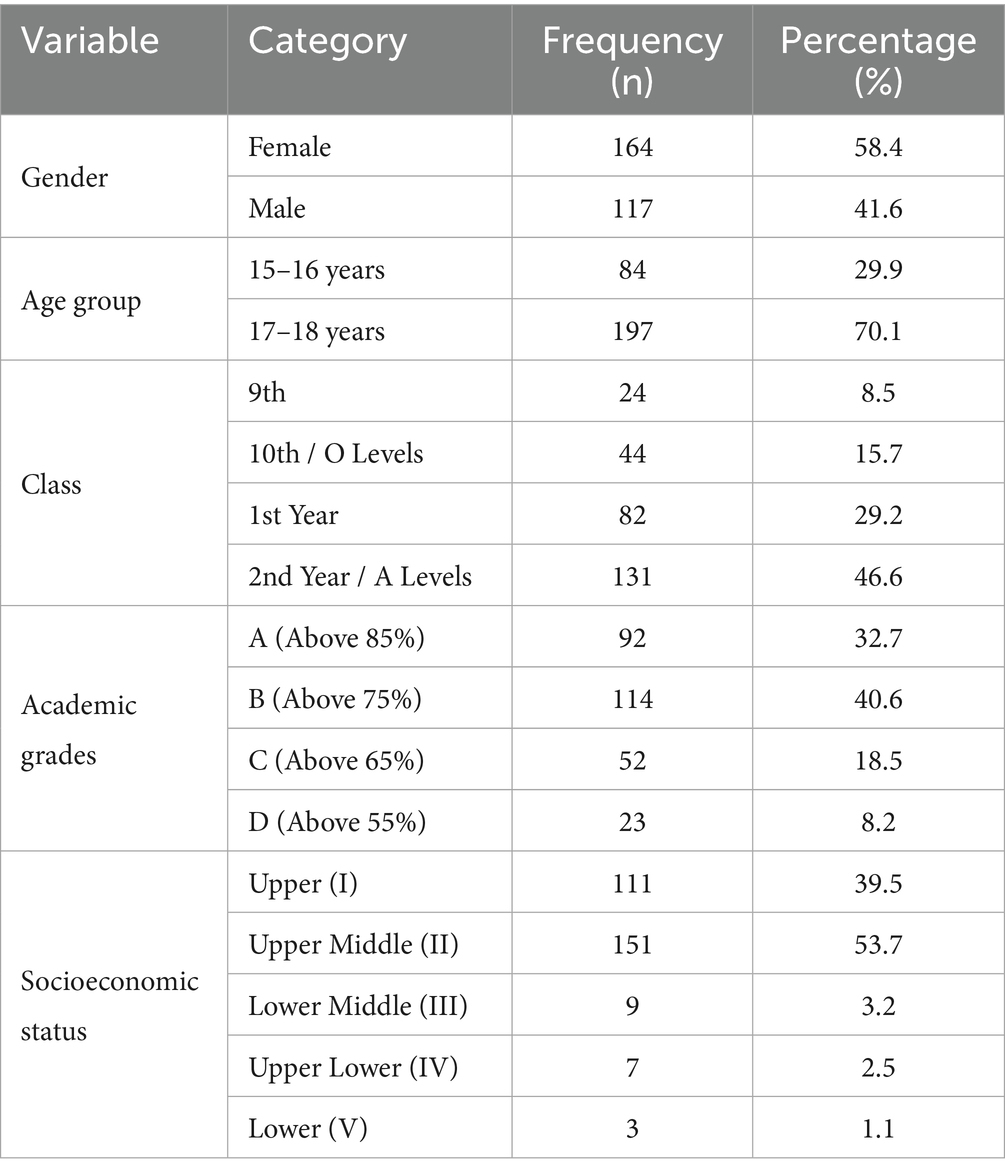 As shown in Table 2, out of the total 281 participants, 117 (41.6%) were male and 164 (58.4%) were female. The age distribution indicated that the majority, 197 (70.1%), were in the 17–18-year age group. Regarding academic level, 131 (46.6%) participants were enrolled in 2nd year or A-Level programs. In terms of academic performance, 92 (32.7%) students scored an A grade (≥85%), while 114 (40.6%) achieved a B grade (≥75%). The majority of participants, 151 (53.7%), belonged to the Upper Middle (II) socioeconomic class, whereas 9 (3.2%) and 7 (2.5%) were classified under the Lower Middle (III) and Upper Lower (IV) categories, respectively.