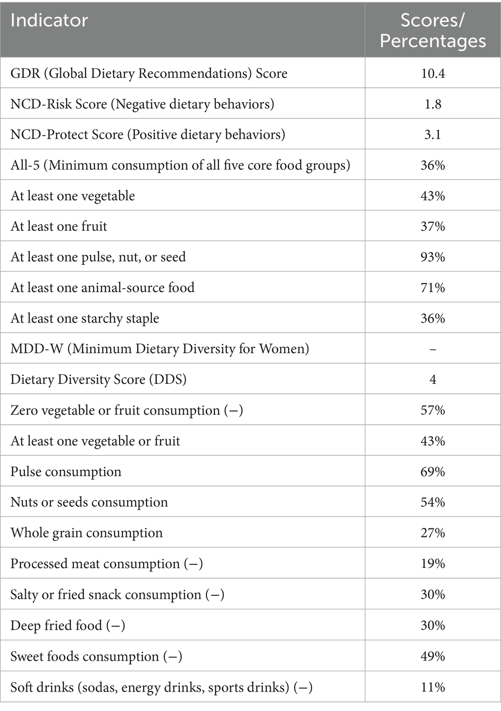 The Diet Quality Questionnaire (DQQ) was used to assess dietary patterns of adolescents. It is a valid tool developed by the Global Diet Quality Project to standardize the assessment of diet quality across populations (29). It consists of 29 yes/no questions regarding food and drink consumption during the previous 24 h, covering core food groups (grains, pulses, fruits, vegetables, and animal-based foods), discretionary foods (fried foods, sweets, and snacks), and beverages (milk, tea, juices, and carbonated drinks). The tool provides dietary diversity indicators and allows estimation of diet quality by categorizing participants into poor, moderate, or good dietary intake based on the number of food groups consumed (30). Responses were coded as “1” for consumption and “0” for non-consumption, and scores were summed to reflect overall dietary diversity.