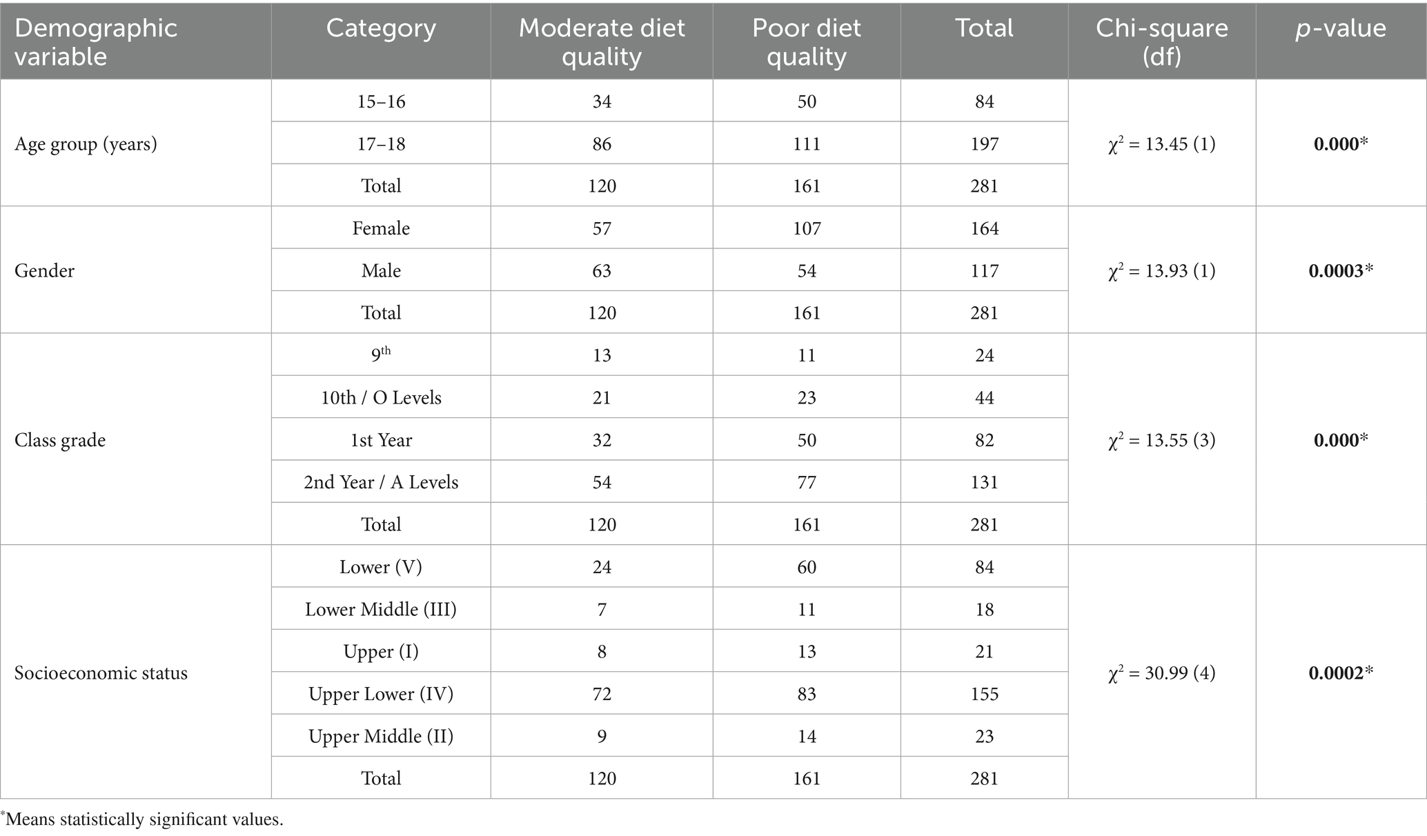 Table 4 summarizes the associations between various demographic factors and diet quality among 281 participants, categorized into moderate and poor diet quality groups. A significant relationship was found between age group and diet quality (χ2 = 13.45, p = 0.000). Participants aged 15–16 years (50 out of 84; 59.5%) had a higher proportion of poor diet quality compared to those aged 17–18 years (111 out of 197; 56.3%), indicating that younger adolescents were more likely to exhibit poorer dietary habits. Gender was also significantly associated with diet quality (χ2 = 13.93, p = 0.0003). Females were more represented in the poor diet quality category, with 107 out of 164 (65.2%) experiencing poor diet quality compared to 54 out of 117 (46.2%) males. Class grade was another demographic variable significantly associated with diet quality (χ2 = 13.55, p = 0.000). Students in the 2nd Year/A Levels class (77 out of 131; 58.8%) had the highest number of participants with poor diet quality, whereas 9th grade students (17 out of 42; 40.5%) showed relatively fewer cases of poor diet quality. This suggests that as students’ progress to higher academic levels, their risk of developing poorer dietary habits increases. Socioeconomic status also showed a strong and significant association with diet quality (χ2 = 30.99, p = 0.0002). Participants from lower socioeconomic groups, particularly those in the Lower (V) category (26 out of 34; 76.5%) and Upper Lower (IV) category (58 out of 85; 68.2%), had a higher prevalence of poor diet quality compared to those in higher socioeconomic brackets.