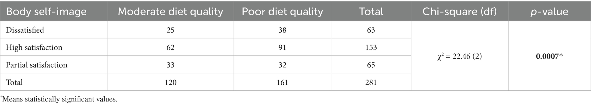 Table 6 illustrates the relationship between diet quality and satisfaction levels among 281 participants. A chi-squared test of independence was performed to explore the association between diet quality and satisfaction levels among 281 students. The Chi-Square statistic was 22.46, with 2 degrees of freedom, and the p-value was 0.0007.