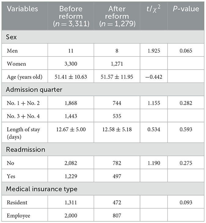 A total of 4,590 patients were included in the final study (3,311 before the reform and 1,279 after the reform). There were no differences in sex, age, admission quarter, length of stay, readmission or not, and medical insurance type between the two groups of patients before and after the DIP payment reform (both P > 0.05). The detailed information was shown in Table 1.