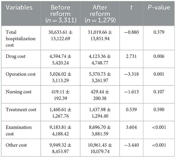 The drug cost and examination cost of the breast cancer cases after the reform were lower than those before the reform (P < 0.001). Liu et al. (7) reported that after the DIP payment reform, the proportions of drug cost and examination cost decreased in a tertiary hospital in Guangzhou, which was similar to the present research findings. The operation cost the cases after the reform were higher than that before the reform, as shown in Table 2. There were no differences in total hospitalization cost, nursing cost, and treatment cost between the two groups of patients before and after the DIP payment reform (both P > 0.05). A study conducted by Gan et al. (8) also revealed that the operation cost after the DIP payment reform was higher than that before the reform. Qu et al. (9) found that the medical insurance surplus for cases treated with surgery was higher than that for cases treated without surgery. The possible reasons include the following aspects: the DIP payment reform has established a “surplus retention and overspending sharing” mechanism, which prompts hospitals to actively control costs, optimize the treatment process, reduce the use of expensive drugs, and minimize excessive medication and excessive testing behaviors. The essence of the increase in operation cost for inpatients is value reconstruction, which objectively promotes the transformation of medical services from “relying on medicine to support medicine” to “relying on technology to support medicine” and enhances the technical value of doctors (10).