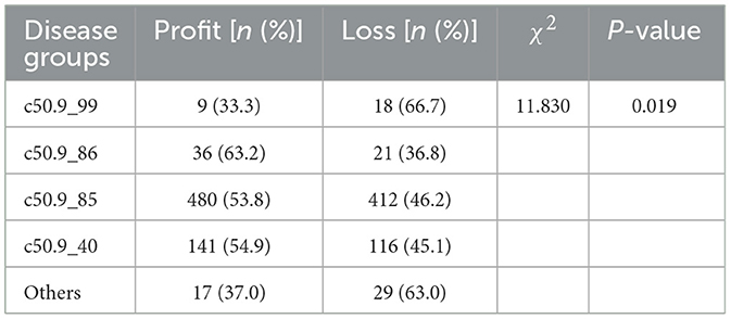 Profit and loss were determined according to the balance of medical insurance. A positive balance was defined as a profit, and a negative balance was defined as a loss (a positive balance means that the medical insurance surplus is positive. A negative balance refers to a situation where the medical insurance account has a deficit). Based on the same major diagnosis principles (ICD-10) and similar treatment procedures (ICD9-CM-3), breast cancer inpatients are classified into five DIP disease groups, such as c50.9_99, c50.9_86, c50.9_85, c50.9_40, and others. The detailed explanation of the “disease groups” can be found in Supplementary Table S1. The profit proportion of the five groups is different (χ2 = 11.830, P = 0.019). The result was shown in Table 3. The profit proportion of c50.9_86 disease group was the highest, 63.2%, and the loss proportion of c50.9_99 disease group was the highest, 66.7%. The possible reason may be that group c50.9_86 has a high disease score and group c50.9_99 has a low disease score. Some patients in group c50.9_99 have exceeded the limit of medication, such as using expensive Pegylated Recombinant Human Granulocyte Colony Stimulating Factor for Injection beyond medical insurance restrictions.