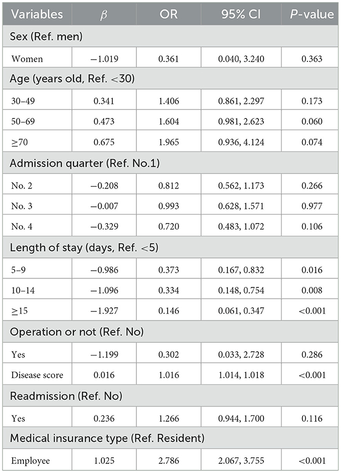 Binary logistic regression analysis was carried out in the DIP group with the loss after reform as the reference group. The results showed that the length of hospital stay is the protective factor of profit, the disease score and the medical insurance type are the risk factors of profit. The probability of profit for patients hospitalized for 5–9, 10–14, and 15 days or more is 0.373 times, 0.334 times, and 0.146 times that of patients hospitalized for less than 5 days, respectively. The probability of profit for employee medical insurance type is 2.786 times that of resident medical insurance. The higher the disease score, the easier it is to make a profit. Sex, age, admission quarter, operation and readmission were not associated with profit in DIP patients (all P > 0.05, Table 4). Hosmer–Lemeshow goodness-of-fit test was used to analyze the model fit of logistic regression. The result showed that the model fits well (χ2 = 7.021, P = 0.534). Gan et al. (8) analyzed the costs of inpatient patients in a tertiary public hospital in Guangzhou under the DIP payment reform. The results showed that the longer the hospital stay, the more likely there was a loss; the higher the disease score, the more likely there was a profit. In line with the present study, Qu et al. (9) also observed a higher medical insurance surplus from employee insurance cases compared to resident insurance cases under the DIP payment reform.