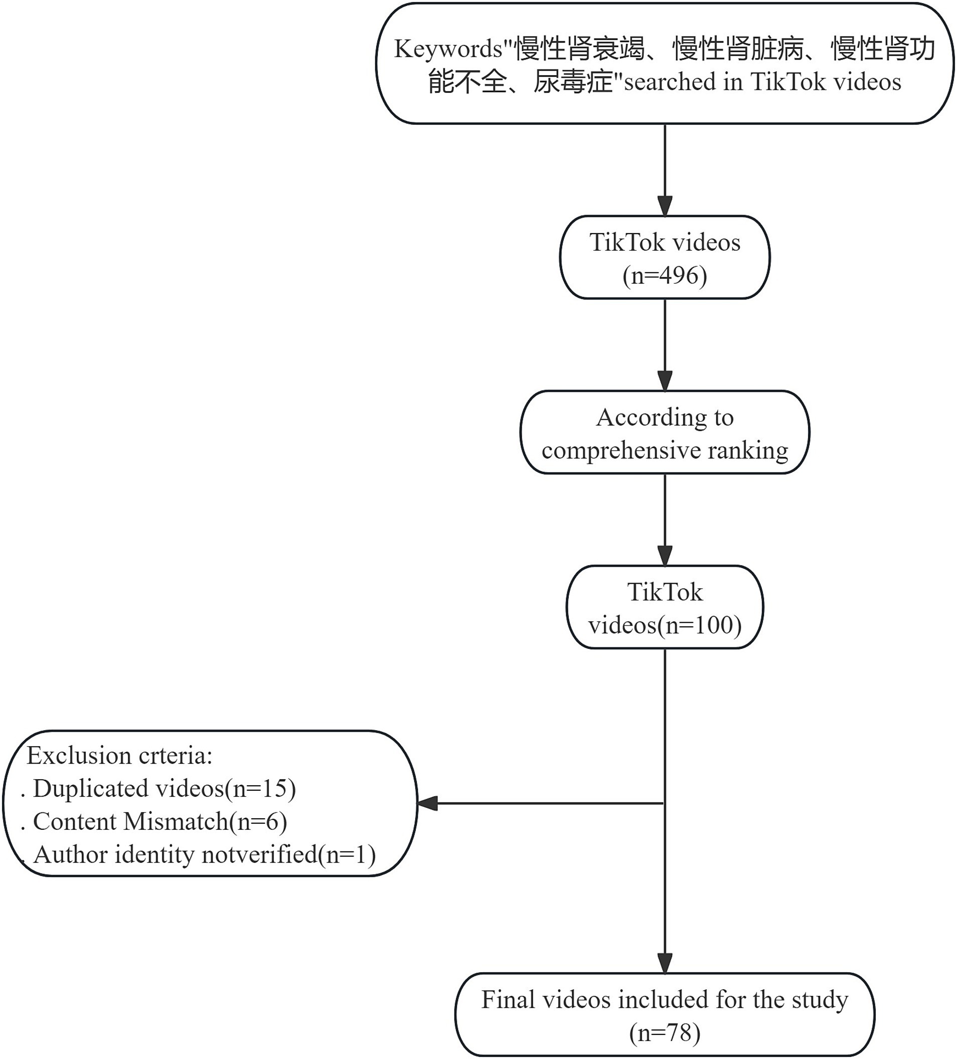 To minimize the impact of big data recommendations and personal preferences, a new account was created in the Chinese version of TikTok. We searched in the Chinese version of TikTok with the keywords “慢性肾衰竭” (chronic renal failure), “慢性肾脏病” (chronic kidney disease), “慢性肾功能不全” (chronic renal insufficiency), and “尿毒症” (uremia). According to TikTok’s default settings, videos were sorted by comprehensive ranking, with no restrictions on release time. Comprehensive ranking considers factors such as video completion rate (proportion of viewers who watched more than 5 s), like rate, comment rate, follow rate, and upload time. This ranking helps identify recently uploaded and popular videos (24). The top 100 videos were selected after excluding graphics, untitled videos, non-Chinese videos, and those deleted by the time of scoring. Previous research has shown that videos outside the top 100 do not significantly impact studies (25–27). Content discrepancies, duplicate videos, and those claiming to be medical professionals without verification were removed from the initial set of 100 videos; 78 videos were included in the final study (Figure 1). This cross-sectional study focused on analyzing the content of these selected videos. Characteristics of each video were recorded and analyzed: number of likes, number of comments, number of shares, number of collections, number of downloads, release date, video duration, source of video (publisher), certification status of healthcare professional, and number of followers of the video publisher.