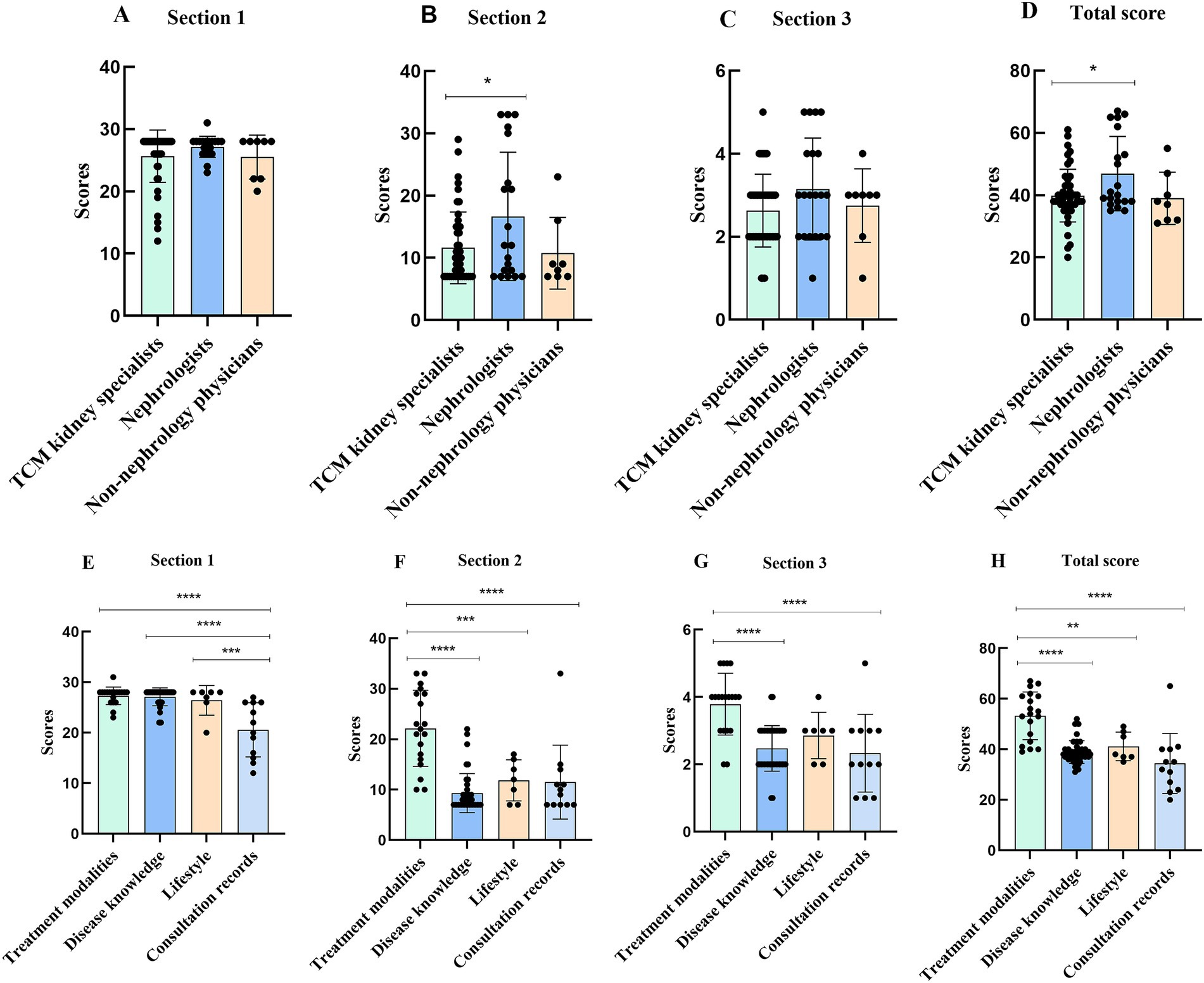 Figure 2. DISCERN scores for TikTok videos of different sources (A, B, C, D) and contents (E, F, G, H). *p < 0.05, **p < 0.01, ***p < 0.001, ****p < 0.0001.
