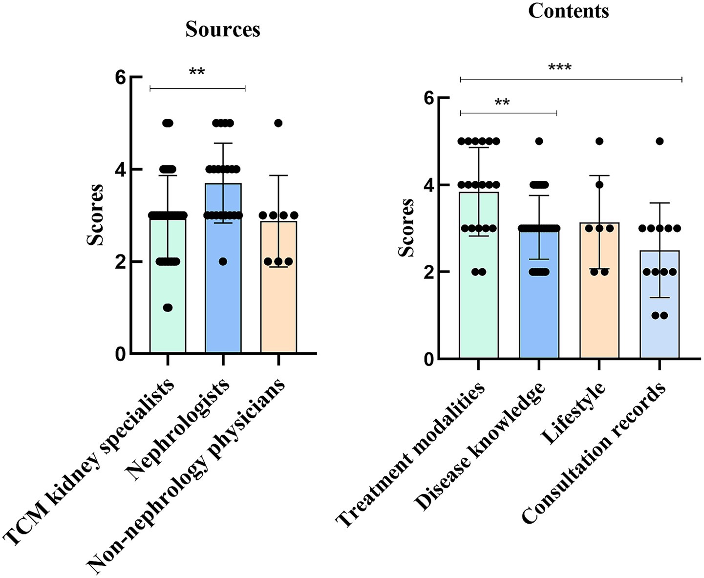 In the GQS analysis, videos from nephrologists scored significantly higher than those from TCM kidney specialists (p = 0.0075). Additionally, videos on treatment modalities scored significantly higher than those focused on disease knowledge and consultation records (p = 0.0086 and p = 0.0007) (Figure 3).