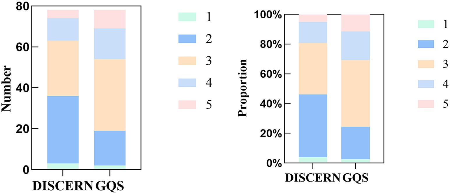 According to the DISCERN and GQS, chronic renal failure-related videos of quality score on TikTok are not high, mainly at poor (42.31%) and moderate (44.87%). We put these five levels in one-to-one correspondence, and the 5-level scores show some inconsistencies in DISCERN and GQS. This result is different from the previous study (25) (Figure 4; Table 3).