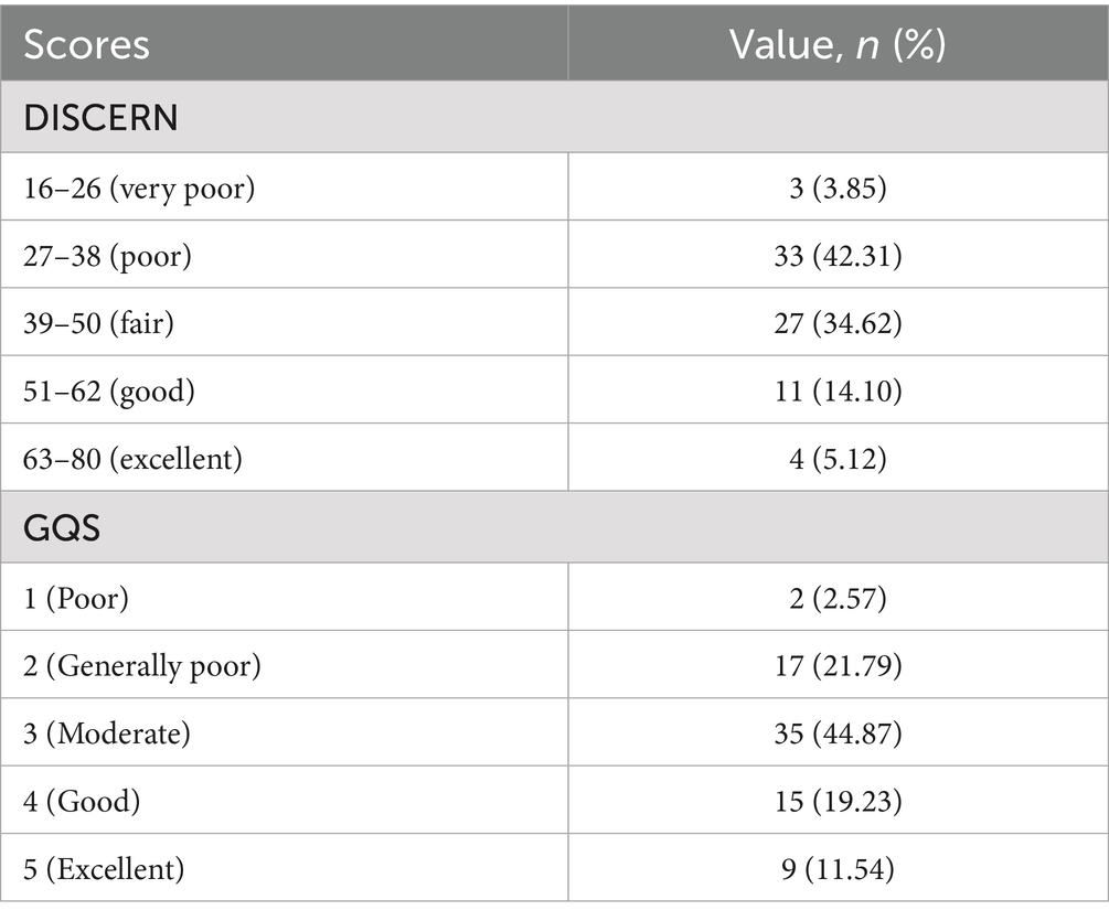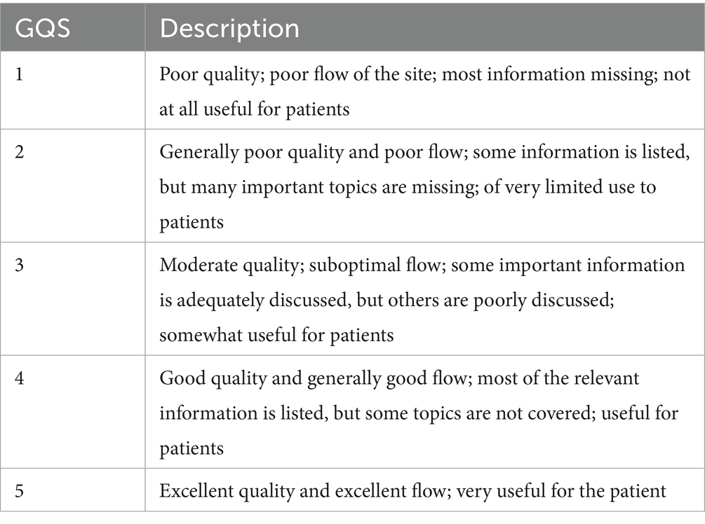 Previous studies have indicated that the JAMA benchmarking standard (28) was not effective in accurately assessing video quality (25, 29). This study used the DISCERN tool (30) and the GQS to evaluate the reliability and quality of video content. The DISCERN tool includes 16 questions divided into three sections: section 1 (questions 1–8) assesses the reliability of the video, section 2 (questions 9–15) evaluates the quality of treatment information, and section 3 (question 16) rates the overall quality. Each question on the DISCERN tool is rated on a 5-point scale, ranging from 1 (very poor) to 5 (excellent). The total score for all 16 questions ranges from 16 to 80, with ratings categorized as 16–26 (very poor), 27–38 (poor), 39–50 (fair), 51–62 (good), and 63–80 (excellent) (31, 32). The GQS evaluates video content on five criteria, with scores ranging from 1 (poor) to 5 (excellent) (Table 1) (33). Although DISCERN was not initially designed for assessing health-related videos, both DISCERN and GQS have been widely adopted for this purpose in recent years (17, 21, 22, 26, 27, 29, 34).