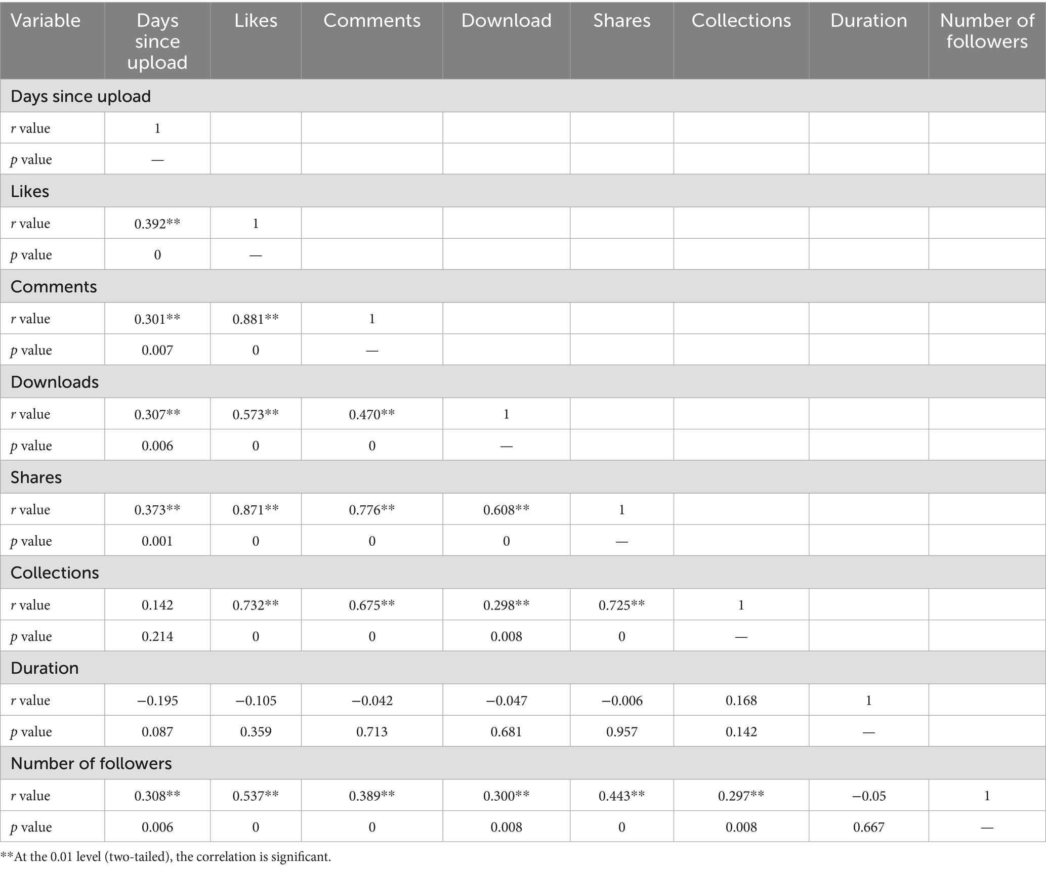 Spearman’s correlation analysis showed that the number of followers was positively correlated with all video characteristics, except that it was not statistically significant with video duration. In addition, the following variables were positively correlated: days since upload with likes (r = 0.392, p < 0.01), upload with comments (r = 0.301, p = 0.007), upload with downloads (r = 0.307, p = 0.006), and upload with shares (r = 0.373, p = 0.001); likes with comments (r = 0.881, p < 0.01), likes with downloads (r = 0.573, p < 0.01), likes with shares (r = 0.871, p < 0.01), and likes with collections (r = 0.732, p < 0.01); comments with downloads (r = 0.470, p < 0.01), comments with shares (r = 0.776, p < 0.01), and comments with collections (r = 0.675, p < 0.01); downloads with shares (r = 0.608, p < 0.01) and downloads with collections (r = 0.298, p = 0.008); and shares with collections (r = 0.725, p < 0.01) (Table 4).