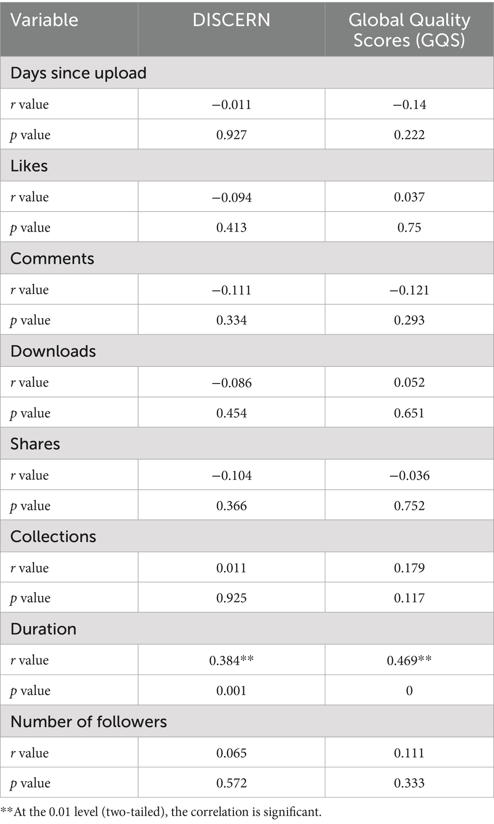 DISCERN scores were positively correlated with video duration (r = 0.384, p = 0.001), which aligns with findings from a previous study by Sun Fei on gallstone-related videos on TikTok (25). Similarly, the GQS showed a positive correlation with video duration (r = 0.469, p < 0.01). However, Jiankun Wang’s research on hypertrophic scarring found no significant correlation between video duration and DISCERN and GQS scores (15). There is no statistically significant relationship between DISCERN and GQS scores and video popularity and number of followers (Table 5).