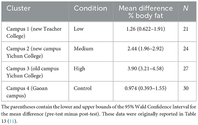 Wang et al. (11) aimed to examine the effects of three different resistance training loads versus a control on body composition and nutritional intake in a sample of women who were overweight or had obesity. The twelve-week resistance programs were designed to be completed using loads defined as the following: (a) Low-intensity (LI): 45–50% one-repetition maximum (1RM), (b) Moderate-intensity (MI): 60–65% 1RM, and (c) High-intensity (HI): 75–80% 1RM. The manuscript (11) defined four campuses in Yichen, Jiangxi, China, which were used to complete this trial, with each campus representing a single cluster: LI was completed at the “new campus” of Early Childhood Teachers College, while MI was completed at the “new campus” and HI was completed at the “old campus” of Yichun College. The control group (CG) was conducted at the Early Childhood Teachers College Gaoan campus. Therefore, the participants were not randomly assigned to a particular campus or group, but instead, each naturally occurring group (i.e., cluster) was assigned a resistance training protocol. To illustrate, Table 1 was created with the data in the manuscript and the data provided in Supplementary material, specifically with the change in percent (%) body fat. We thank the authors for their transparency and for making their raw data publicly accessible. Our intent with Table 1 is to clearly show that one cannot separate whether the differences in mean responses are due to the treatment (e.g., high vs. low loads) or the unique characteristics of the clusters (i.e., campuses) themselves. Said differently, there is no within-cluster variation in treatment assignment; group (treatment) is perfectly collinear with cluster.