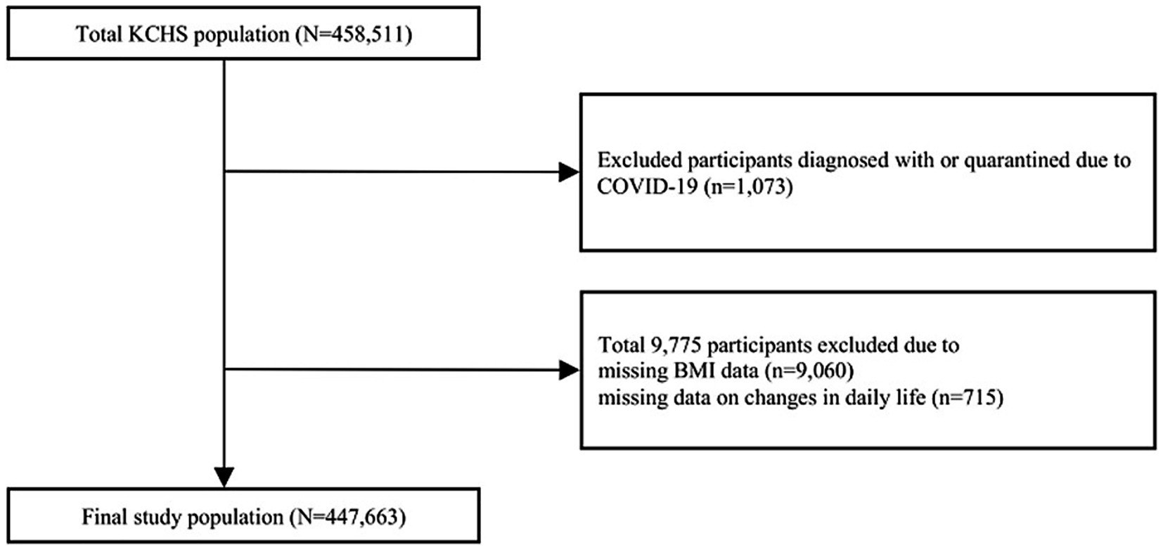The KCHS is a nationwide, community-based survey conducted by the Korea Centers for Disease Control and Prevention to investigate the public health status and health behaviors of individuals aged 19 years or older (9). It covers the provinces of 254 districts across 17 metropolitan cities, with household systematically selected based on local districts. Approximately 900 individuals from each district were chosen through a multistage probability sampling design based on community classification and type of residence (9). A total of 458,511 participants were surveyed in 2020 and 2021. We excluded 10,848 individuals who were either diagnosed with or quarantined due to COVID-19 (n = 1,073), had missing BMI data (n = 9,060), or had missing data on daily life changes during the COVID-19 pandemic (n = 715). Finally, 447,663 individuals were included in the analysis (Figure 1). This study met the criteria for exemption from the Institutional Review Board because of the use of anonymized KCHS data open to the public.