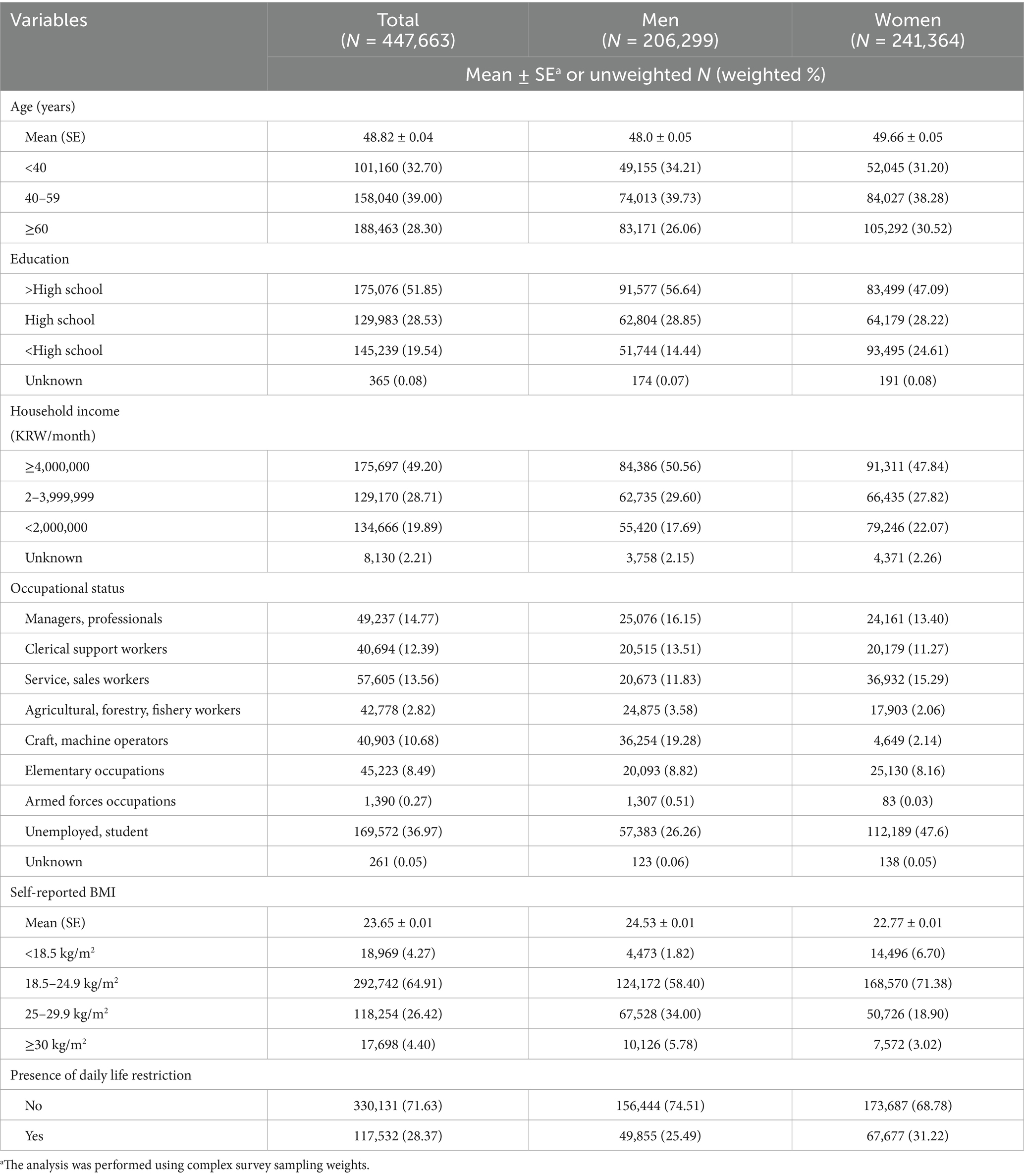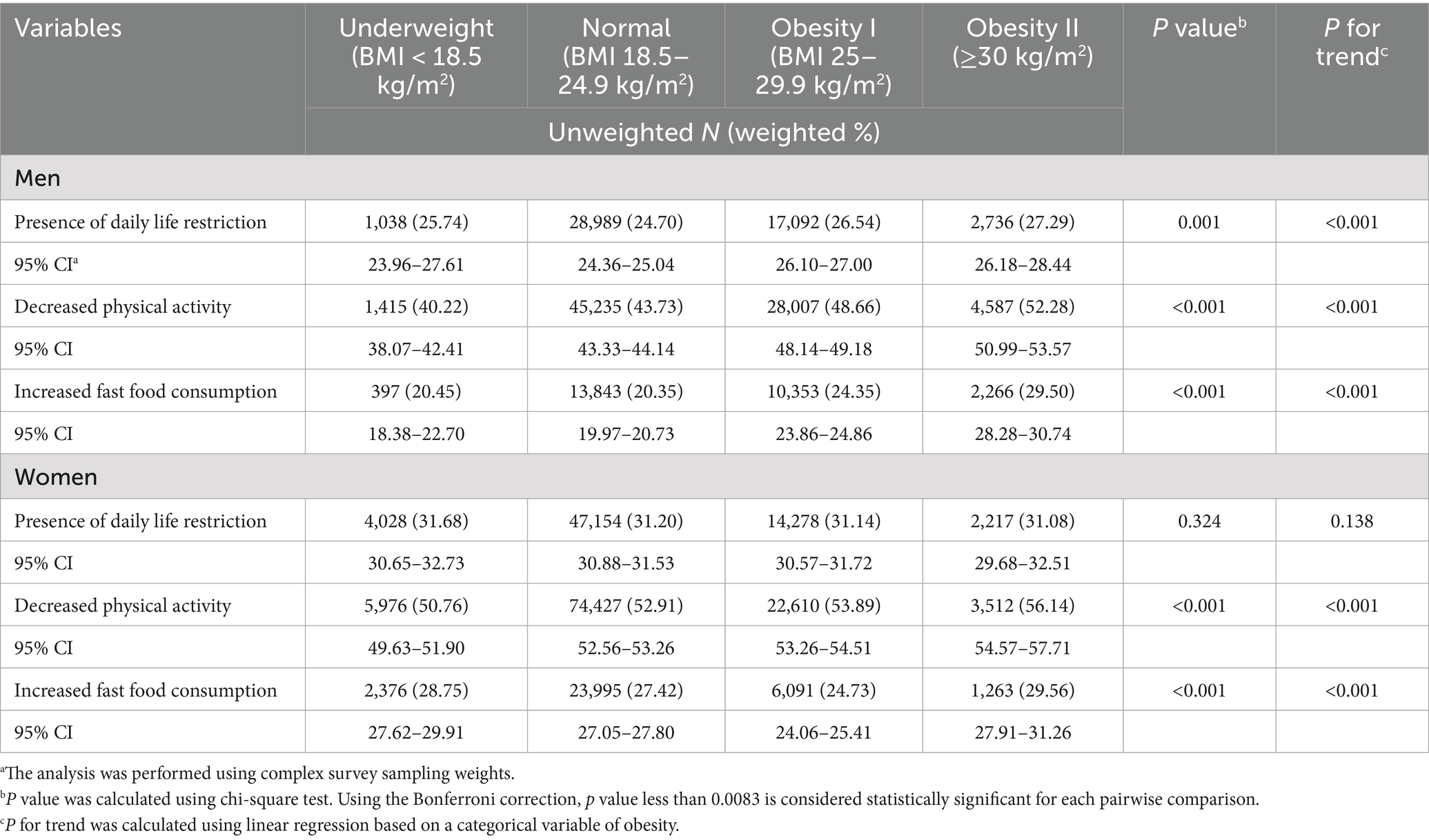 Since the Korea Community Health Survey is a sample survey rather than a complete enumeration, the analysis was conducted using a complex sample design to reduce bias when estimating results for the general population. The stratification variable was kstrata (considering region, age, and sex), the cluster variable was spot_no (representing sampling are number), and the sampling weight variable was wt_p. The characteristics of the study population are presented as unweighted sample counts and weighted percentages stratified by sex. We compared the presence of daily life restrictions, decreased physical activity, and increased fast food consumption according to obesity groups, which are presented as weight percentage with P for trend. Since the obesity group was categorized into four groups, Bonferroni correction was applied for multiple comparisons, and a p value less than 0.0083 was considered statistically significant. P for trend was calculated using linear regression based on an ordinal categorical variable of obesity. Logistic regression analyses were performed to calculate the odds ratios (ORs) and 95% confidence intervals (CIs) for the presence of daily life restrictions according to the BMI group, with the BMI group treated as a categorical variable. In logistic regression analysis, P for trend was calculated based on an ordinal categorical variable of obesity. Multivariable analysis was performed after adjusting for age, sex, marital status, income, educational status, and occupational status. Low income and low educational status are well-known risk factors of obesity (11, 12), and marital status has also influenced body weight (13). Additionally, occupational types are closely associated with obesity (14). Therefore, we adjusted for these variables as potential confounders in our analysis. We conducted a complete case analysis, as missing values accounted for less than 5% of the data. Sensitivity analysis was performed using score-based cut-offs, dividing individuals whose daily life was restricted to 50 points or less into intervals of 10 points. Since a score of 100 indicated no restriction, a score of half or lower was regarded as experiencing restriction. All statistical analyses, including survey (svy) analysis, were performed using STATA 16.1 (Stata Corporation, College Station, Texas, USA). Except for multiple comparisons, a two-tailed p < 0.05 was considered statistically significant.
