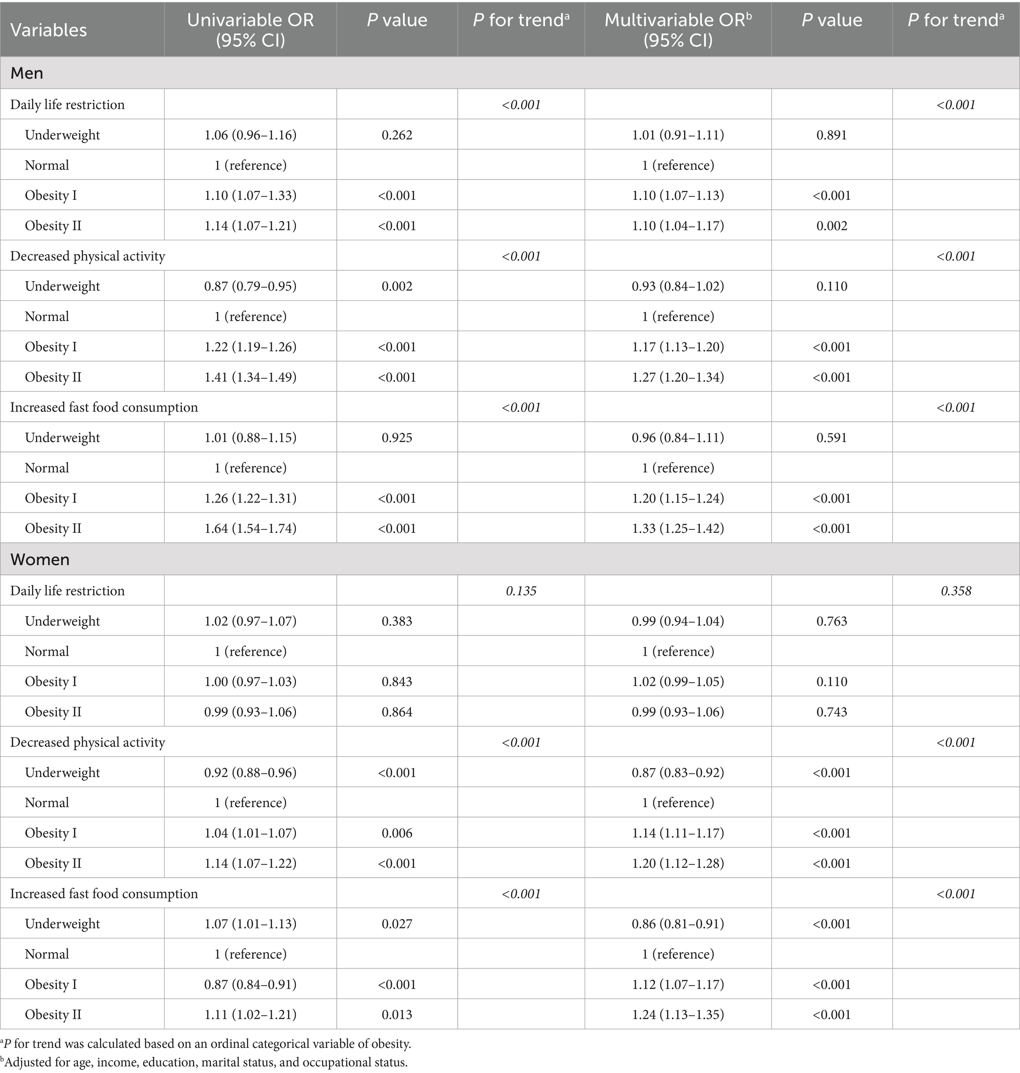 Results: Among men, daily life restrictions increased in obesity I (OR 1.10, 95% CI 1.07–1.13) and obesity II (OR 1.10, 95% CI 1.04–1.17) compared to the normal weight group. Decreased physical activity and increased fast food consumption tended to increase with obesity grade (p < 0.001). Among women, decreased physical activity was associated with both obesity I (OR 1.14, 95% CI 1.11–1.17) and obesity II (OR 1.20, 95% CI 1.12–1.28). Increased fast food consumption were also associated with obesity I (OR 1.12, 95% CI 1.07–1.17) and obesity II (OR 1.24, 95% CI 1.13–1.35). Both factors tended to increase with obesity grade (p < 0.001).