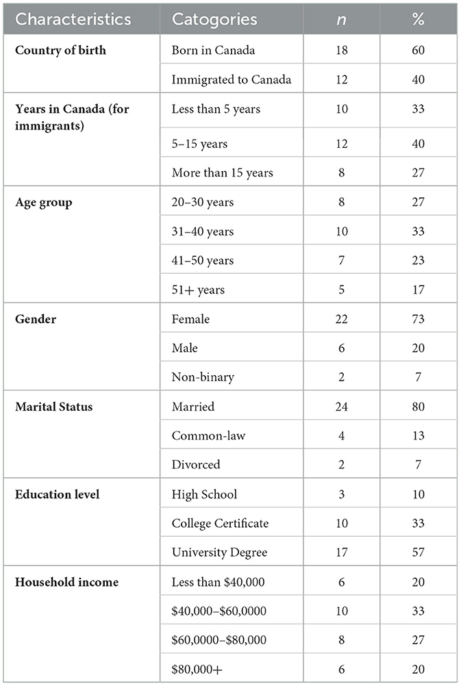 A total of 30 parents participated in the study, divided across six focus groups. The sample was diverse in terms of country of birth, years lived in Canada, age, gender, marital status, education, and household income (refer to Table 1 for consolidated summary of participant demographics).
