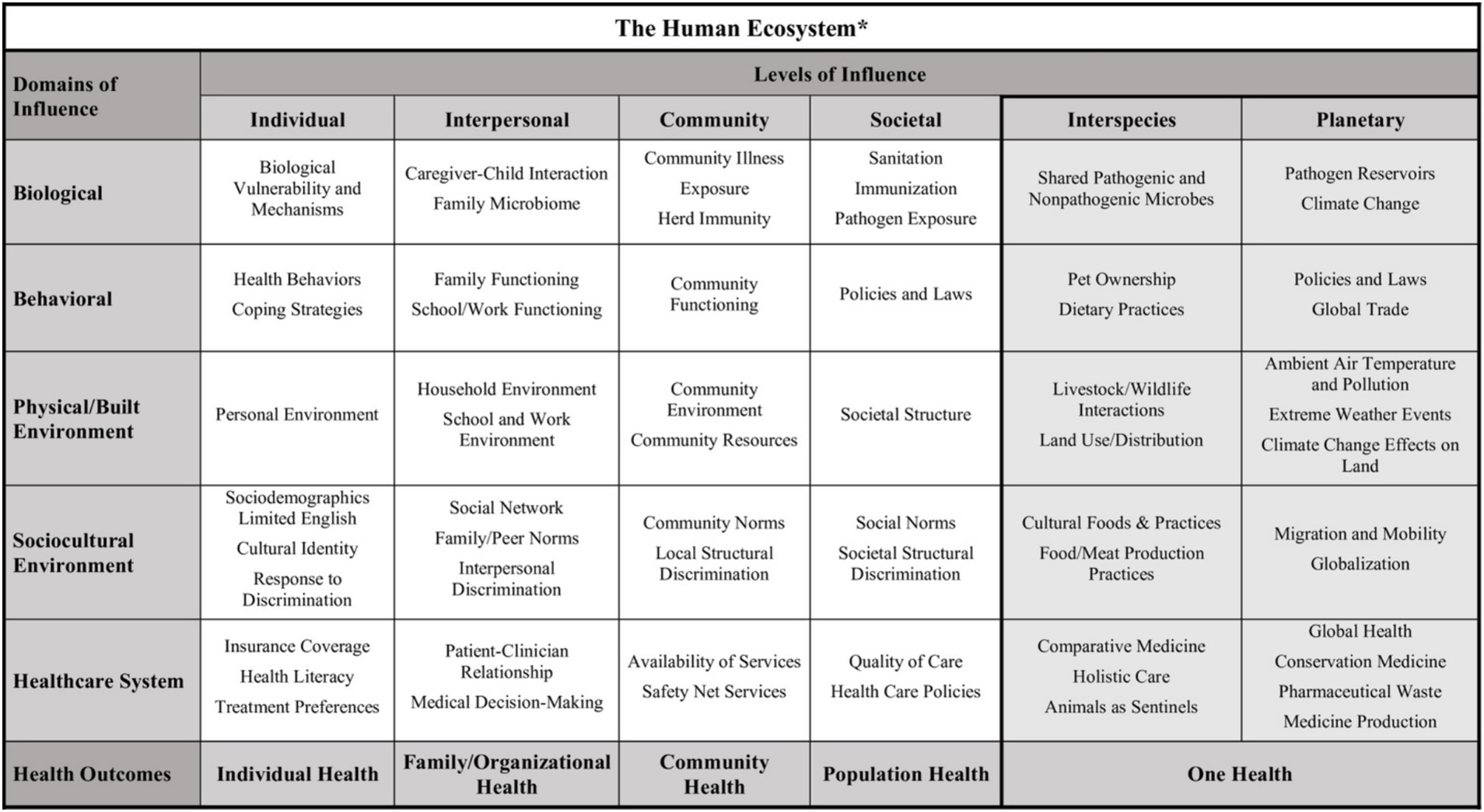 Morgan et al. (36) proposed the integration of a “One Health” approach to the NIMHD framework, adding interspecies and planetary levels of influence to capture some of the most salient arenas in which our interdependence with natural systems materializes (Figure 1). Their stated goal was to reflect “how human health is a product of the human ecosystem, which combines traditionally recognized ecosystem components (plants, animals, microbes, physical environmental complex) with the built environment and social characteristics, structures, and interactions between all these elements” [(36) p. 3].