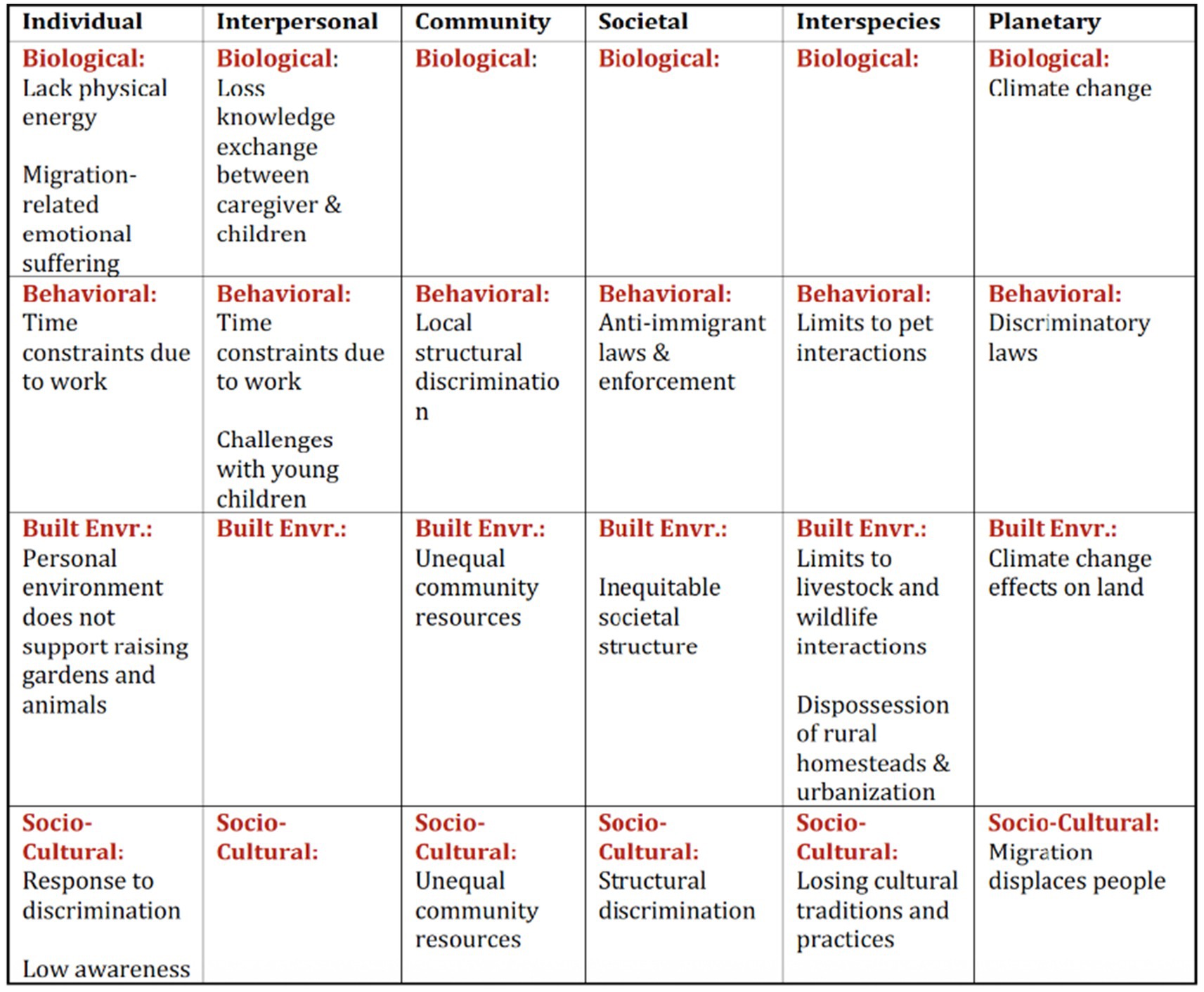 Results: Our analysis revealed barriers across all six levels of influence (planetary, interspecies, society, community, interpersonal, and individual) and multiple domains, including aridification of land, international migration, disruption to interspecies’ relationships, discrimination, lack of time and energy, and emotional distress tied to immigration status.
