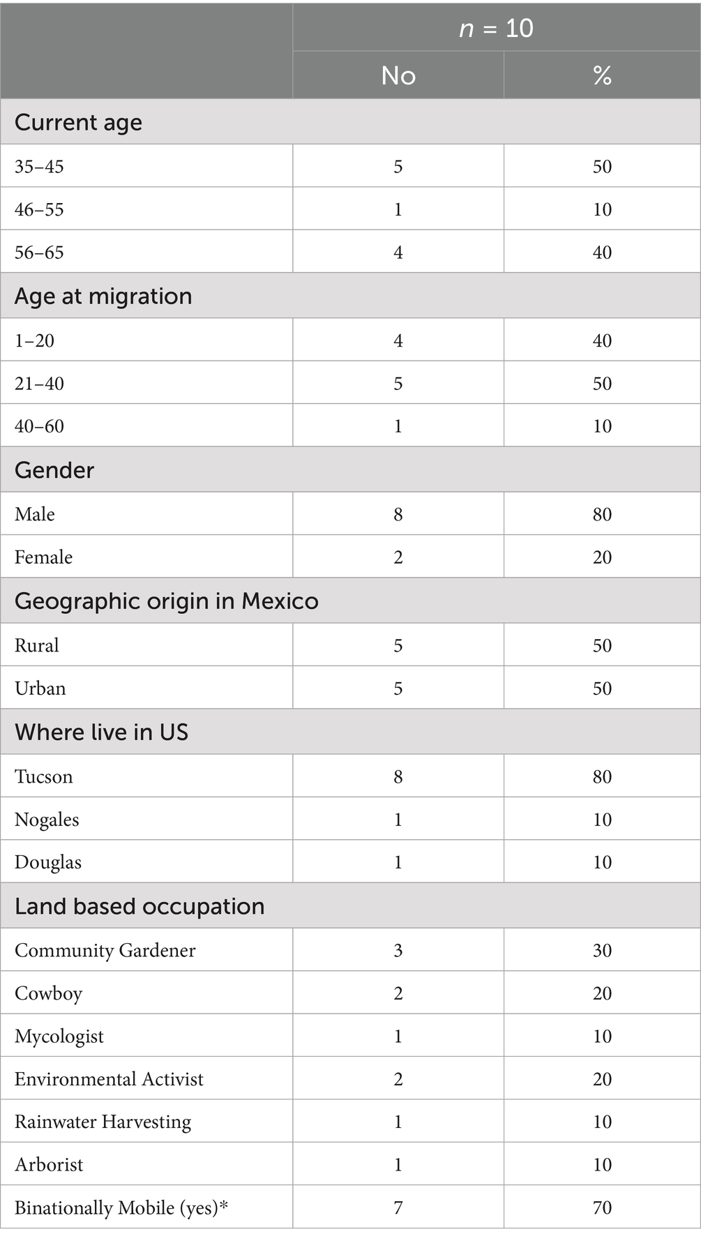 The second sample was composed of Mexican immigrants working in land-based occupations (Table 1) and included eight men and two women. Participants worked in various land-based fields and eight of them were living in Tucson, Arizona and two on rural ranches. Participants were evenly split between having been raised in rural versus urban environments in Mexico before migrating to the U.S.