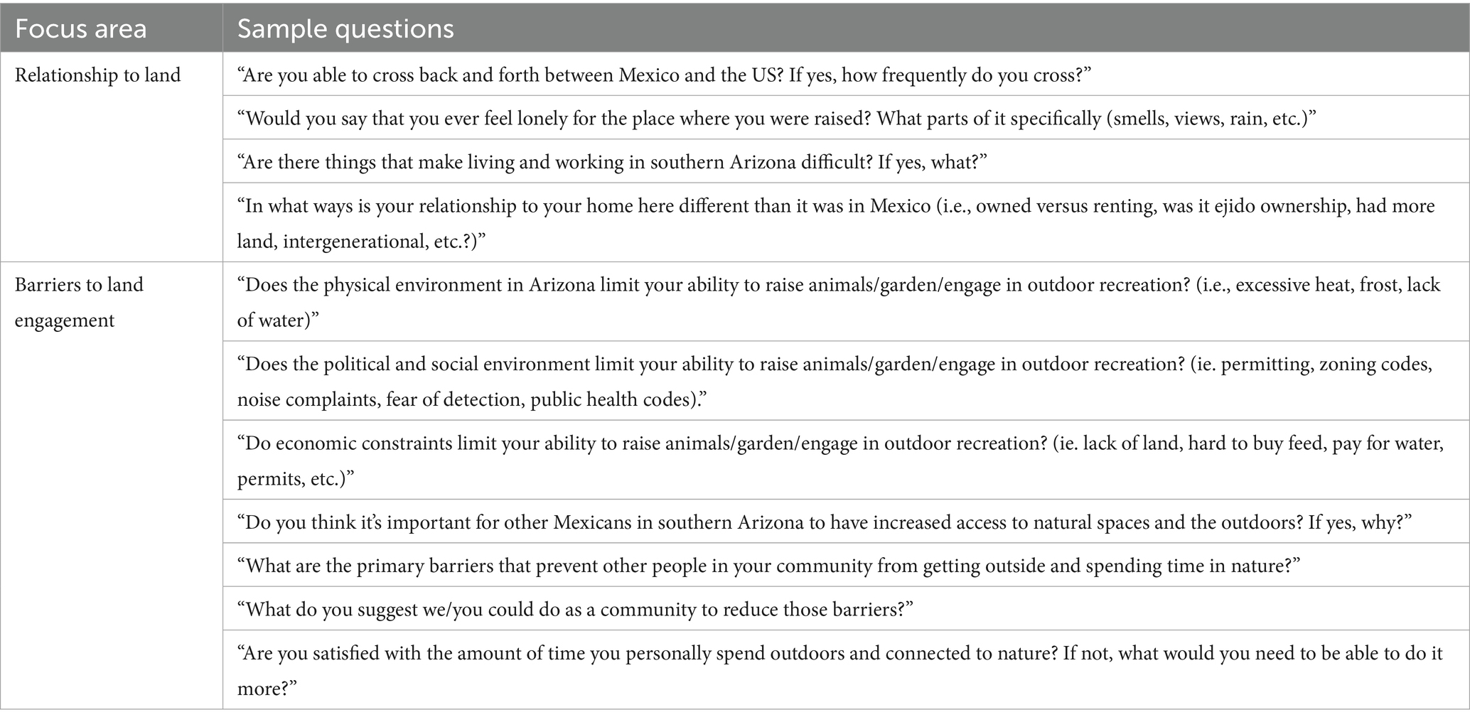 The lead author developed a semi-structured interview guide for stakeholders working to promote nature access among Mexicans in southern Arizona and historical experts on Mexican history in the region, as well as a more in-depth interview guide for first generation immigrants. The latter contained sections on (1) childhood land-based experiences and practices, (2) the migration and displacement process, (3) the re-establishment of nature connections post-migration, and (4) links between nature access and health.
