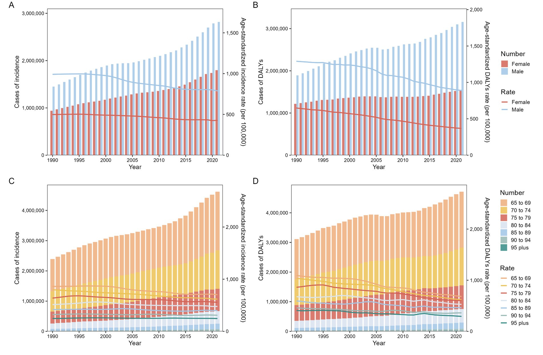 Figure 1. Incidence and DALYs of total burden related to hepatitis B in adults aged ≥65 years from 1990 to 2021 at the global level. (A) Cases and age-standardized incidence by sex; (B) Cases and age-standardized DALYs by sex; (C) Cases and age-standardized incidence by age; (D) Cases and age-standardized DALYs by age. DALYs disability-adjusted life-years.