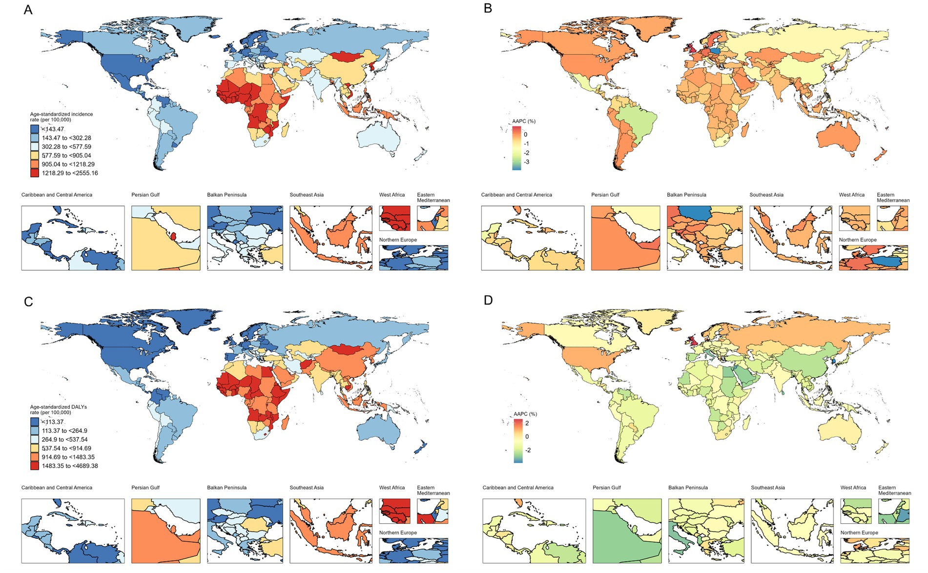 Figure 2. Age-standardized incidence and DALYs of total burden related to hepatitis B in adults aged ≥65 years in 204 countries and territories. (A) Age-standardized incidence in 2021; (B) AAPC in age-standardized incidence from 1990 to 2021; (C) Age-standardized DALYs in 2021; (D) AAPC in age-standardized DALYs from 1990 to 2021. DALYs disability-adjusted life-years, AAPC average annual percentage change.
