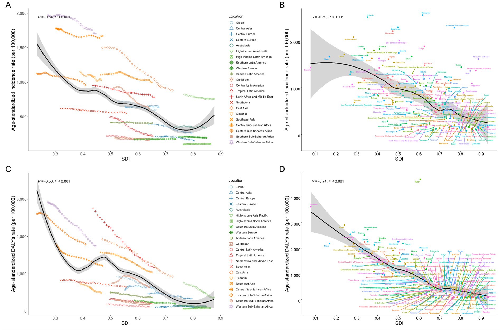 Additionally, the association between SDI and individual health outcome was examined through locally weighted scatterplot smoothing (LOWESS) regression analysis on the aggregated dataset spanning 1990 to 2021. All analyses were conducted using R software (version 4.3.3) and the Joinpoint Regression Program (version 5.0.2). A two-sided p-value <0.05 was considered statistically significant.