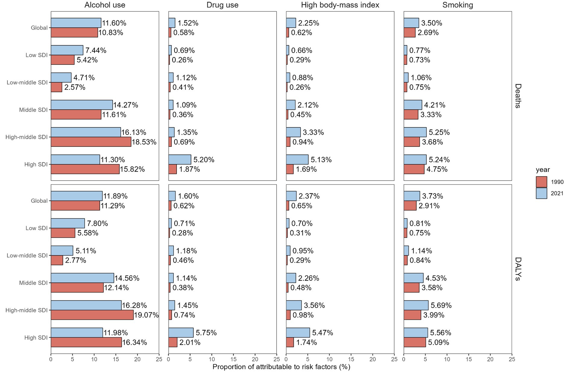 Figure 4. Proportion of deaths and DALYs for total burden related to hepatitis B attributable to alcohol use, drug use, high body-mass index and smoking among people aged ≥65 years from 1990 to 2021 at the global and SDI levels. DALYs disability-adjusted life-years, SDI socio-demographic index.