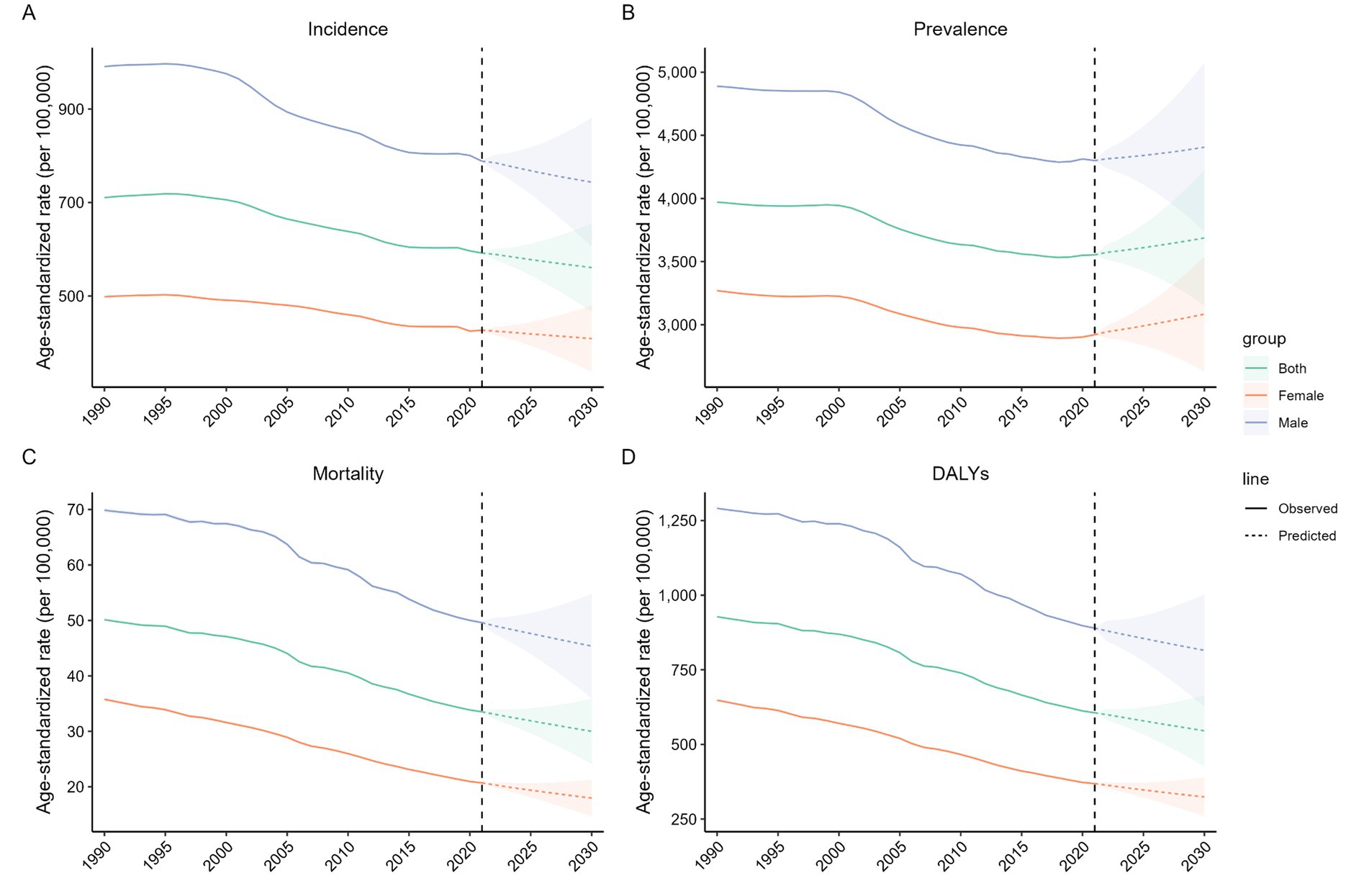 Methods: Drawing upon the Global Burden of Diseases (GBD) 2021, we obtained the data on incidence, prevalence, mortality, and disability-adjusted life years (DALYs) from 1990 to 2021, categorized by sex, age, and socio-demographic index (SDI). Associations of. these metrics and SDI were analyzed. Secular trends were evaluated employing average annual percentage changes (AAPC) and joinpoint regression, with future trajectories estimated through 2030 using the Bayesian age-period-cohort (BAPC) model.