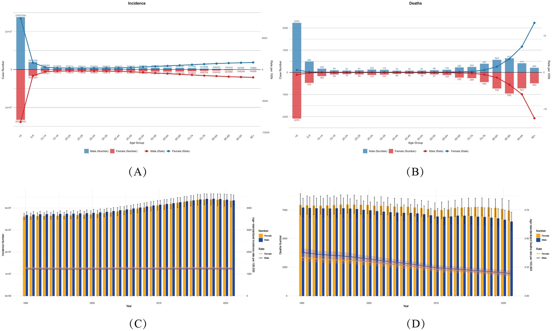 Figure 1. Global varicella and herpes zoster Burden (1990–2021) with Temporal Trends by Sex. (A,B) Age-sex stratified incident cases/deaths (2021) with age-standardized rates (ASIR/ASMR). Numbers above bars: case counts. (C,D) Temporal trends (1990–2021) in ASIR/ASMR by sex. Bands: 95% UIs for rates; error bars: 95% UIs for counts (ASIR, age-standardized incidence rate; ASMR, age-standardized mortality rate; ASDR, age-standardized DALYs rate).