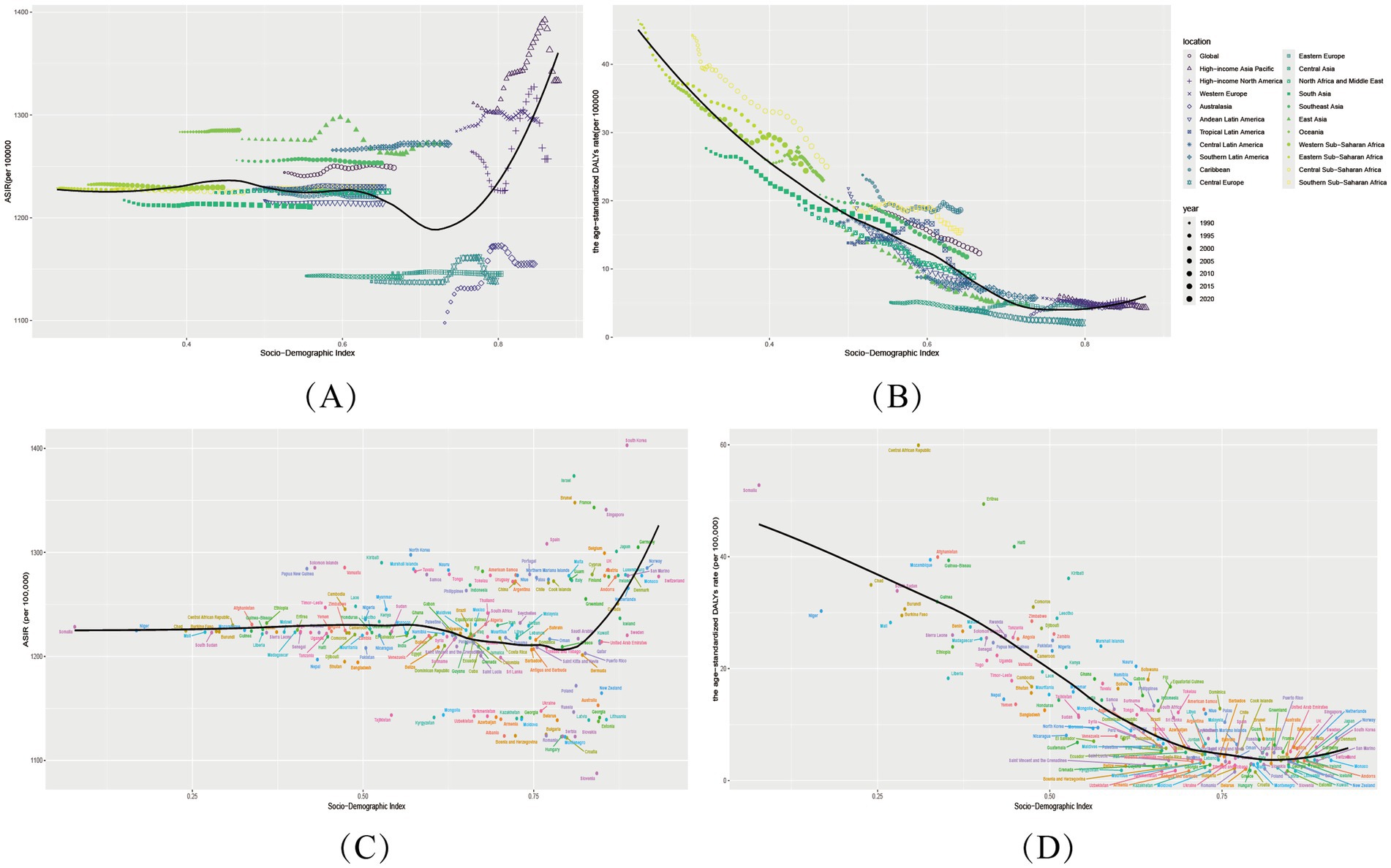 Figure 3. Sociodemographic Index associations with varicella and herpes zoster Burden in 204 Countries and 21 regions. (A,B) Age-standardized incidence (ASIR) and DALY rates (ASDR) across 21 regions by SDI (1990–2021). (C,D) Country-level ASIR and ASDR versus SDI (2021). Shaded areas/error bars represent 95% uncertainty intervals.