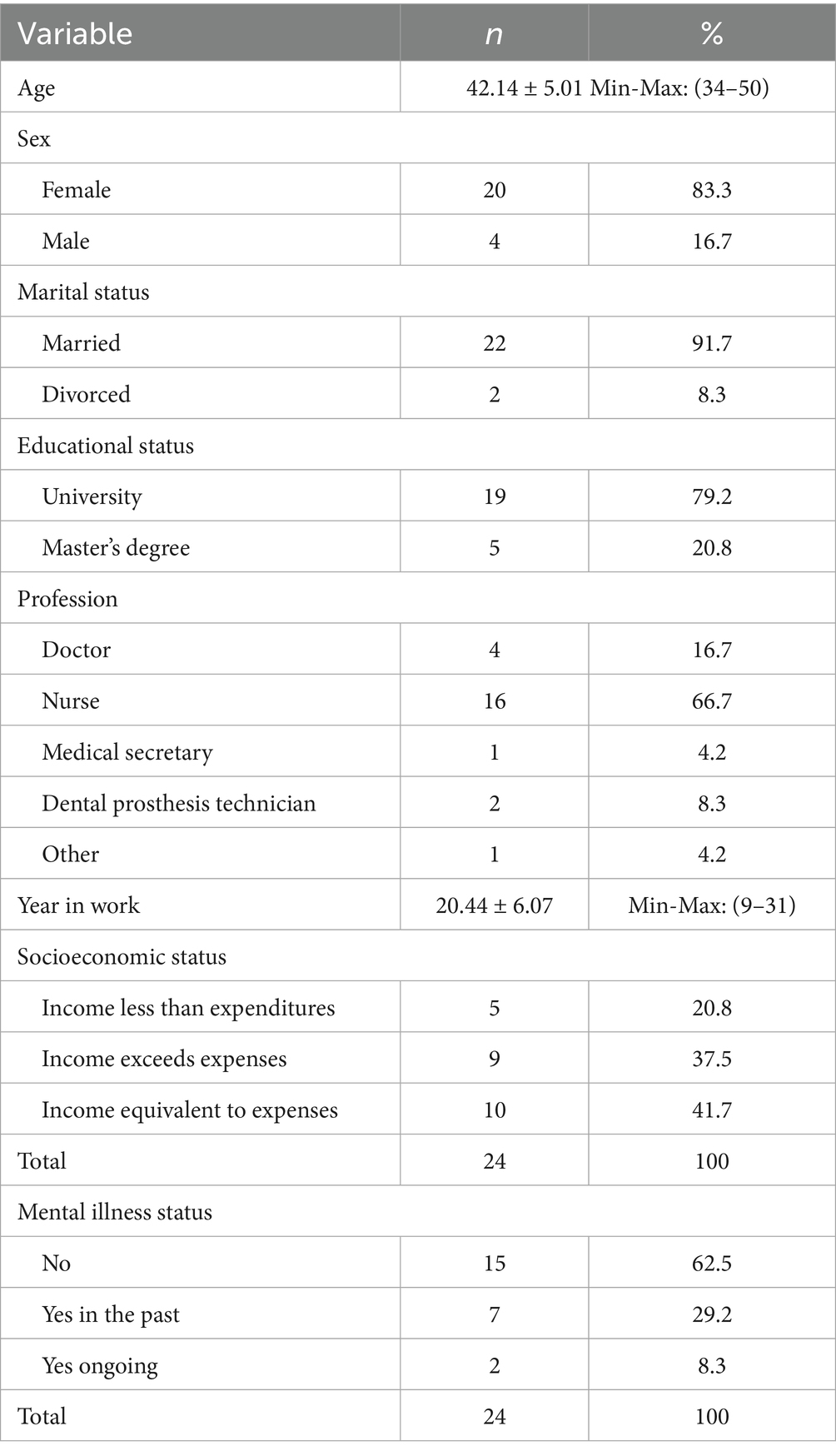 The mean age of the participants was 42.14 ± 5.01, where 83.3% (20) of the participants were female, 91.7% (22) were married, 79.2% (19) were university graduates, and 67% (16) were nurses. The mean years in work of the participants was 20.44 ± 6.07 Min-Max: (9–31) and 62.5% (15) of the participants had no history of mental illness (Table 1).