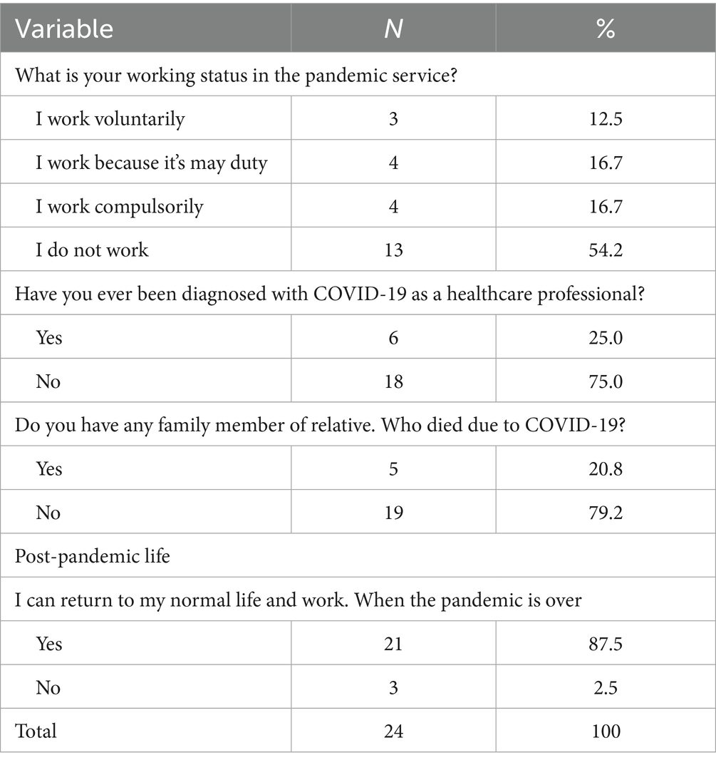 54.2% (13) of the participants did not work in the pandemic ward. 12.5% (3) of the healthcare professionals worked voluntarily. 25% (6) of healthcare professionals were diagnosed with COVID, and 20.8% (5) of them had a relative with COVID diagnosis, who died as a result thereof 87.5% (21) stated that they would be able to return to their normal life and work when the pandemic ended (Table 2).