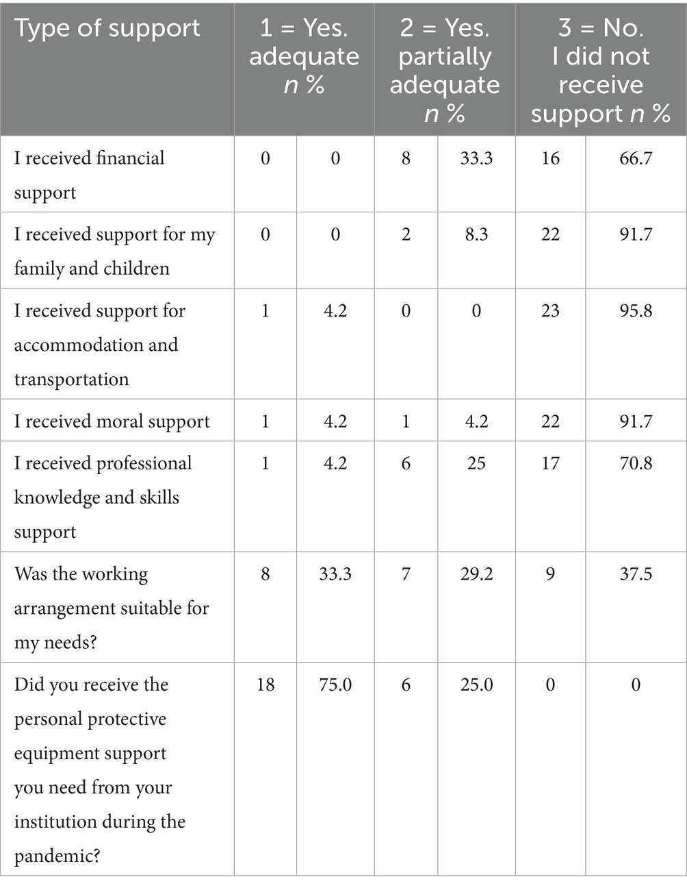 66.7% (16) of the participants did not receive financial support from their institutions, 91.7% (22) did not receive support for the family and their children, 95.8% (23) did not receive accommodation and transportation support, and 70.8% (17) did not receive professional knowledge and skills support during the pandemic process. While 37.5% (9) of the participants reported that their working environment was not suitable for their needs, 75% (18) stated that their personal protective equipment was adequate (Table 3).