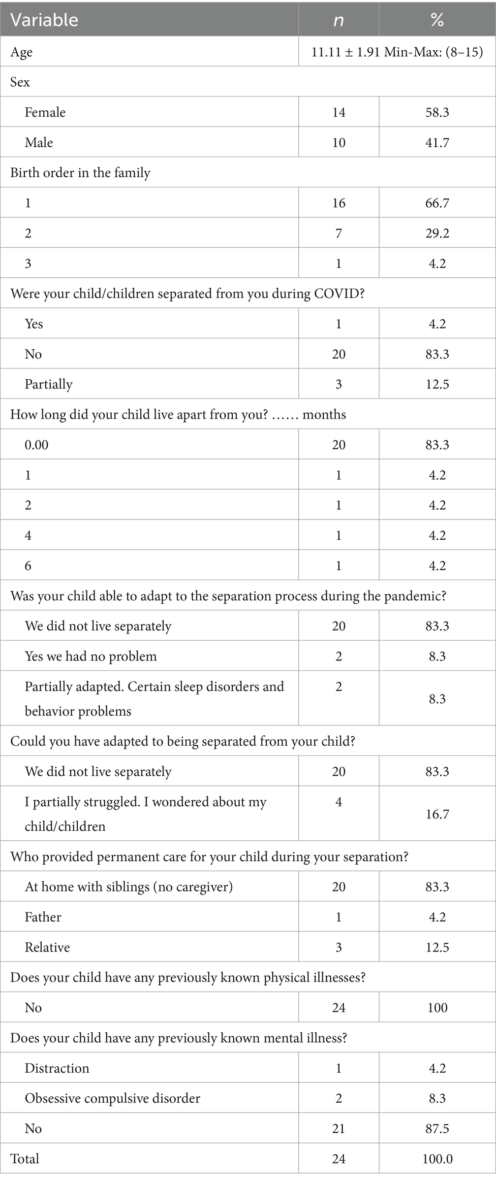 The mean age of the participants was 11.11 ± 1.91 Min-Max: (8–15), 66.7% (16) were the first child of the family, 83.3% (20) were not separated during the COVID pandemic, and 8.3% (2) partially adapted to the separation process. 83.3% (20) of the children stayed at home without a caregiver, when their parents went out to work. Participants had no known physical illness. 87.5% (21) had no known psychological disorder (Table 4).