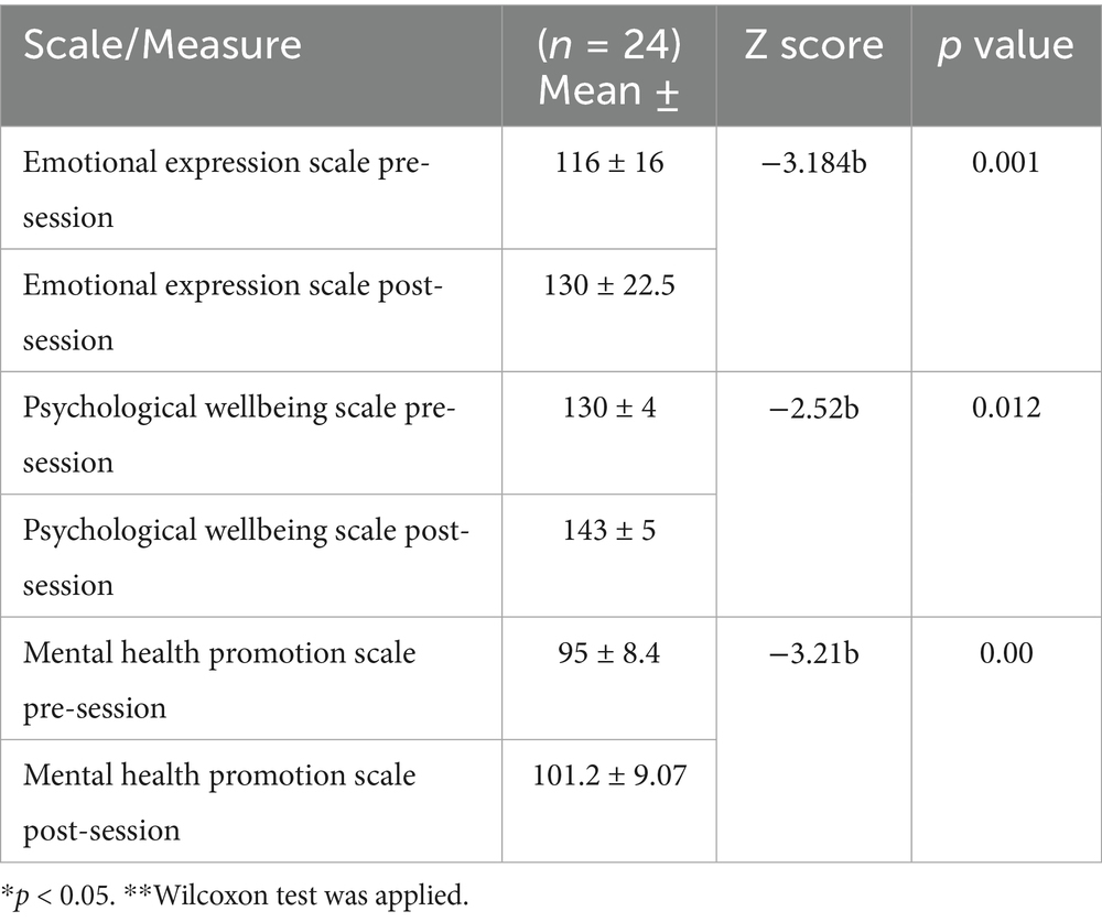 Results: The intervention significantly improved emotional expression, psychological well-being, and mental health promotion scores (p < 0.05). Qualitative findings indicated enhanced self-awareness, improved family communication, and reduced anxiety.