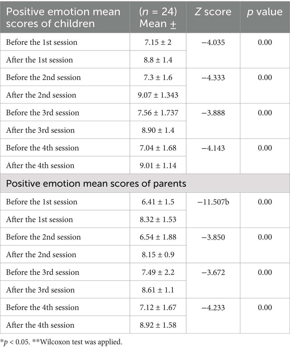 The participant healthcare professionals and children were asked about their feelings before and after art therapy and instructed to rate them. Wilcoxon test was used to analyze, whether there was a significant difference between the mean positive scores prior to and after the session. There was a significant difference in the positive emotion scores of the participants in all sessions (p < 0.05) (Table 6).