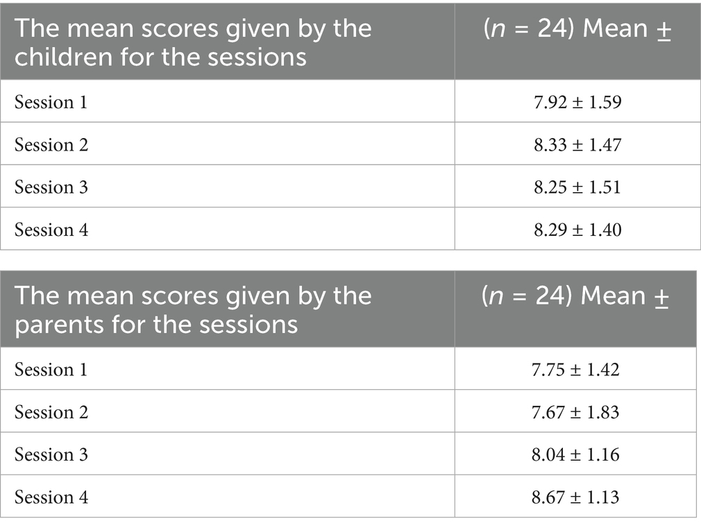 The participant healthcare professionals and children were asked to rate the session with a score between (1–10). The mean scores for each session were tabularized (Table 7).