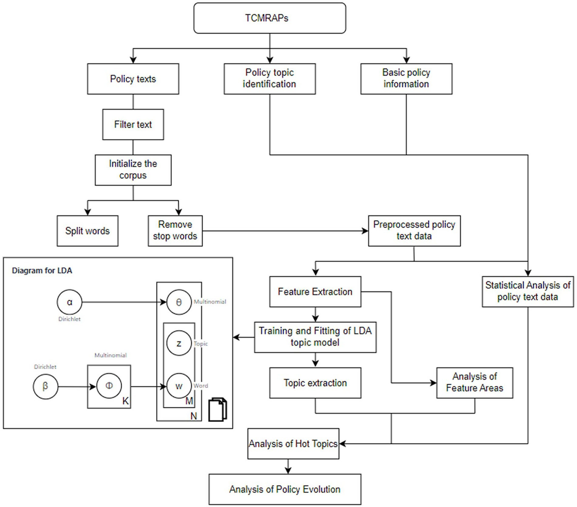 In view of this, this study will systematically collect the policy documents related to the registration and approval of TCM from 1985 to 2024, use the LDA topic model to construct a comprehensive evaluation index system, in-depth explore the connotation of policy texts through quantitative analysis, accurately clarify policy objectives, and reveal the dynamic evolution path of policy topics. This study aims to provide a scientific basis for the optimization and improvement of the registration, review and approval policy of TCM, and help promote the sustained and high-quality development of the TCM industry.