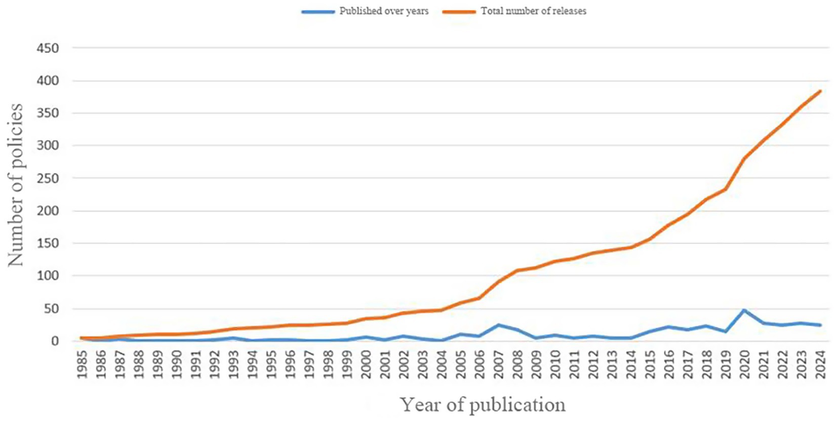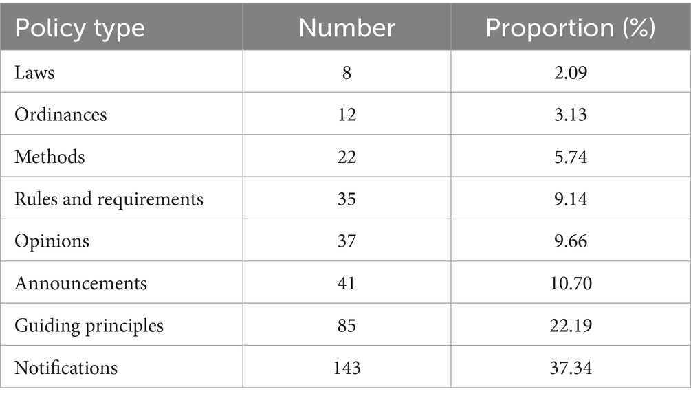 Through preliminary screening, a total of 603 texts were collected, and after policy screening, 383 texts were included in the final study. Among them, the notification policy (37. 34%) accounted for the largest proportion, followed by the guiding principle policy (22. 19%) as shown in Table 2. The amount and cumulative amount of policies line chart for each year are shown in Figure 3.