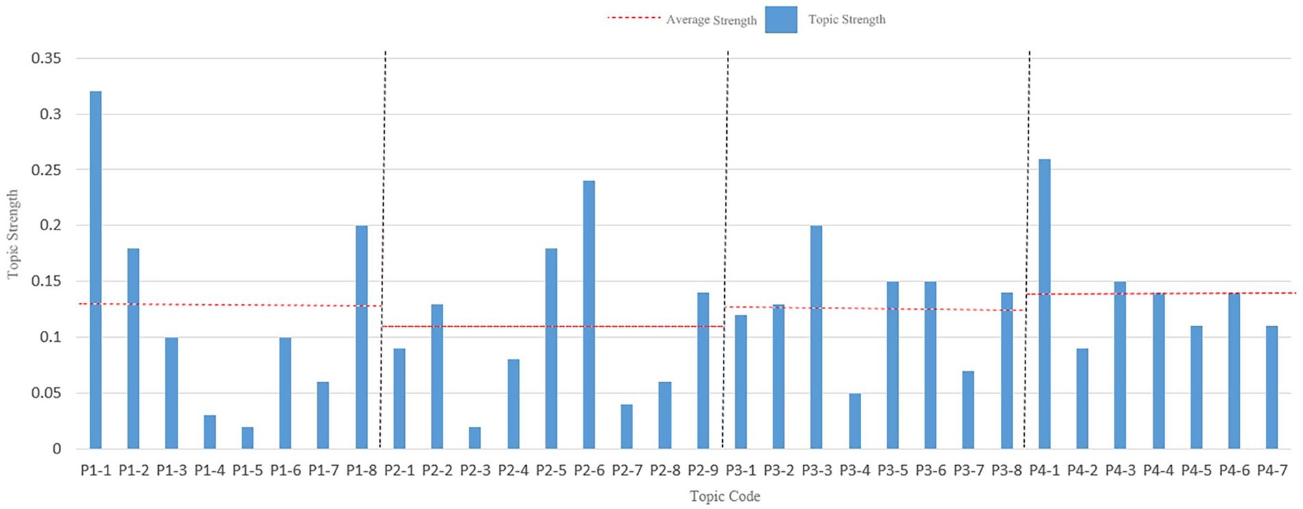 In the formula, M represents the total number of documents (if contextually specific to a report—based corpus). denotes the overall topic intensity of topic j. refers to the weight assigned to topic j within document d, which is used to reflect the significance of the topic within that document. The larger the value of for a topic, the more prominent the proportion of that topic within the document set, and the greater the attention it garners. Thus, a topic with a relatively high value attracts significant focus in the document set. The average topic intensity value across all topics in the document set can be calculated using the formula. In this study, the topic intensity of each topic is calculated and compared with the average topic intensity of the current period, and the topic with greater than the average intensity is the hot topic.