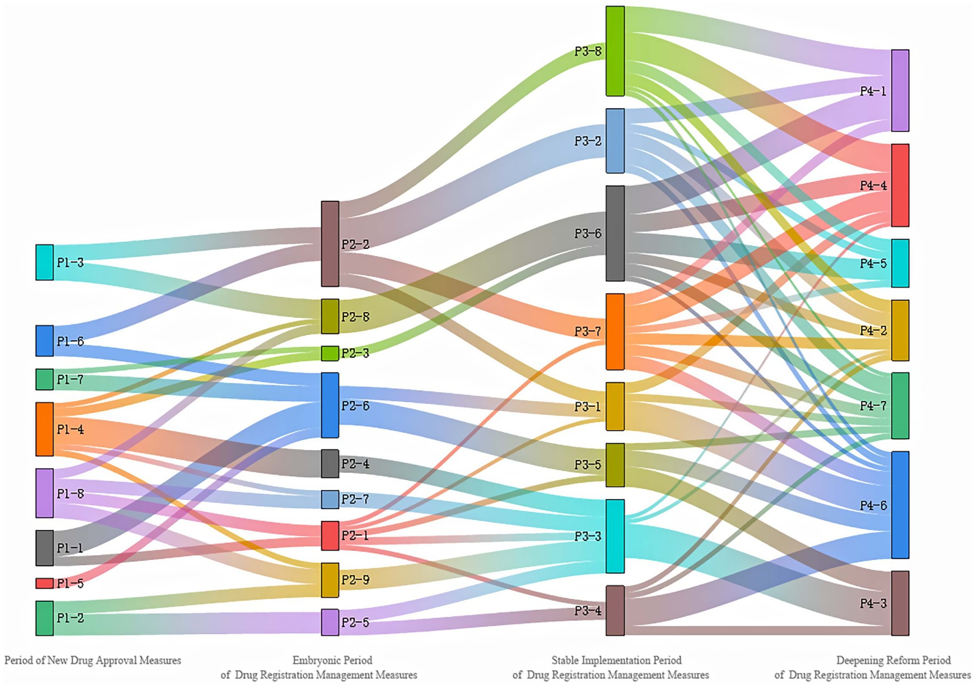 At the same time, in order to further explore the topic evolution process of the four stages, the topic similarity between different stages is calculated according to the toy-word probability distribution obtained by the LDA topic model. According to relevant research (14), the two topics with similarity greater than 0.3 are regarded as the existence of evolutionary relationship, and the topic evolution path of the registration and approval policy of TCM. Sankey diagram of topic relevance is as shown in Figure 7. Among them, each element block corresponds to each topic, and the line between topics represents the flow direction and connection between topics. The thickness of the line represents the similarity degree. The thicker the line, the closer the evolutionary relationship between topics. It is clear that based on Figure 7, the evolution path of China’s TCMRAPs is extremely complex and intricate. Each topic does not exist independently but rather functions as a hub in a network, interacting closely and providing support with other topics.