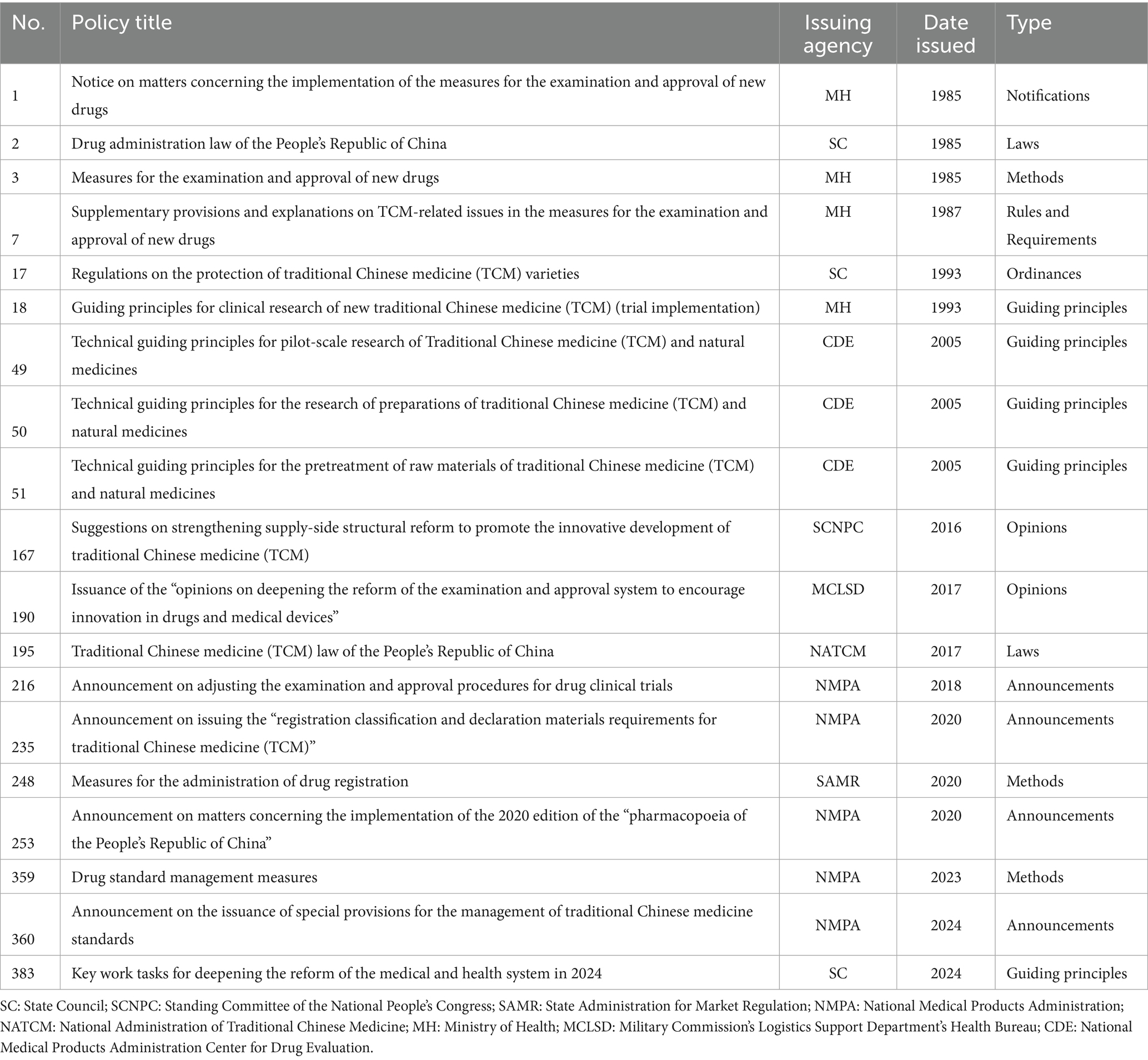 In this study, the relevant policies on the review and evaluation of all TCMRAPs issued by the Chinese government/NMPA are reviewed. The time period selected for this article is from 1 July 1985, to 31 December 2024. Policy texts were mainly retrieved and obtained from the official portal website of China’s central government,1 the Law and Regulation Database of Peking University,2 the China Food and Drug Administration,3 China National Knowledge Infrastructure,4 and other common retrieval platforms. In addition, relevant Supplementary material were searched from Baidu, Google, Bing, and other websites. The selected policy is related to the registration, review, and approval policy of TCM. In addition to “TCM registration,” “TCM review,” “TCM approval,” “New medicine review,” “Drug registration,” the search scope was also expanded by entering keywords such as “TCM innovation” to ensure a comprehensive and careful search. The types of policies retrieved included laws, ordinances, methods, rules and requirements, opinions, announcements, guiding principles, and notifications. Then, the policies that were that were not related to TCMRAPs were excluded through manual screening. Due to the wide timeline span involved, these websites do not provide a detailed classification of these policies. The texts retrieved through keyword search include some that are not policies at all, but rather interviews by TV stations, interpretations of policies by celebrities, highlights of local governments, and so on. These policy documents are not issued at the national level and cannot be deleted through the procedures. Therefore, they need to be manually selected and deleted. Through this comprehensive collection, we ensured the comprehensiveness, authority, and reliability of the analysis results. The study procedures of this study are shown in Figure 1. Some key policies are shown in Table 1.