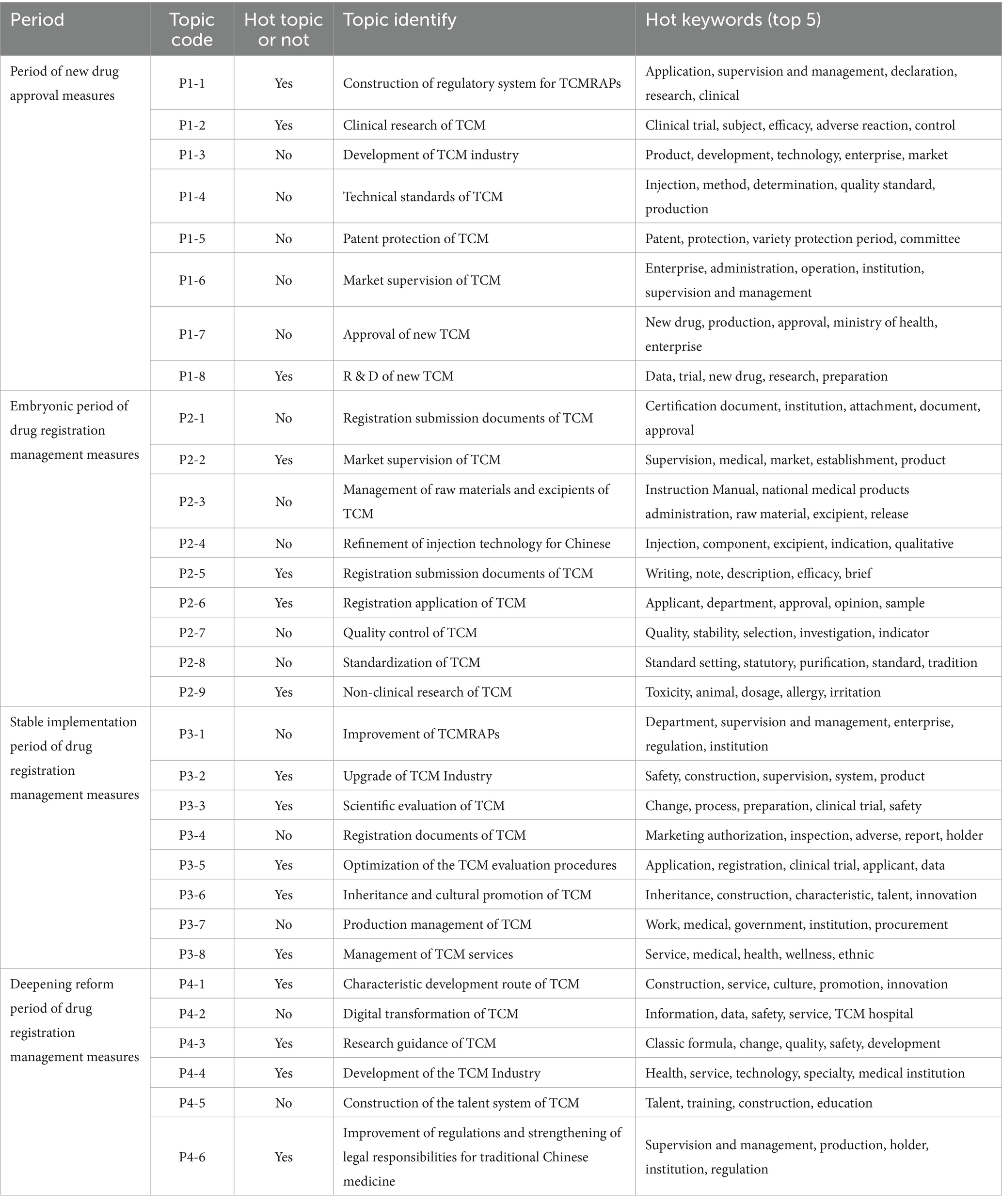 From an international perspective, the policy evolution research method proposed in this study applies to other countries seeking to enhance the level of traditional medicine or cultural heritage. Currently, the classification system for herbal medicines in the European Union is similar to the Chinese classification system for traditional medicine, and such a classification can better manage drug registration (32). Therefore, the European Union is particularly well-suited to using the same analytical methods to study policy evolution. Many other countries worldwide face the shared challenge of balancing the protection of traditional knowledge with the advancement of modern innovation. Examples include the standardization of Ayurvedic medicine in India and the regulated application of African traditional herbs. They can draw on the methods of this study to identify any unreasonable aspects in the evolution of their own policy topics over time and make timely corrections. They can also draw on the topics and hot topics covered by the Chinese traditional medicine registration policy to fill in the topics of their own drug registration policies, enabling the rapid development of the drug registration system. At the same time, they can also draw on the classification system of Chinese registration policies. The significance of this study lies not only in improving TCM development in China but also in offering important references for other countries looking to promote the preservation and advancement of their own traditional medicine and cultural heritage.