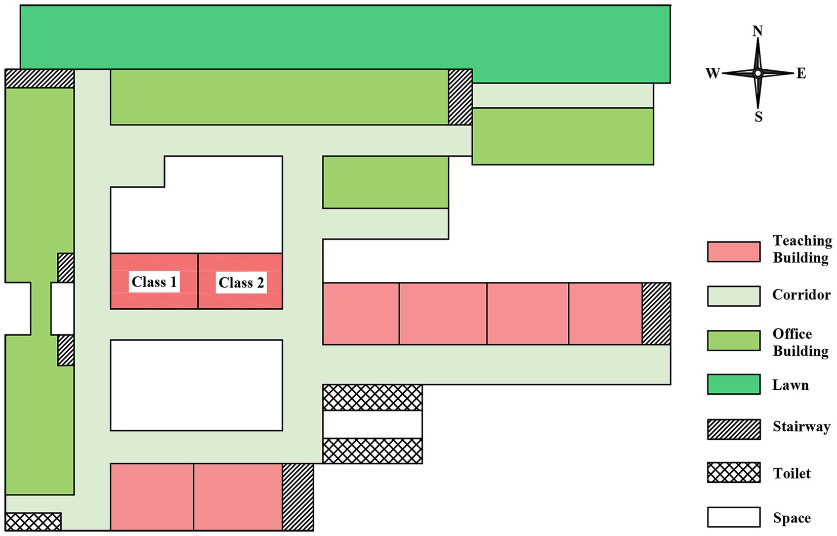 The outbreak occurred at a public high school that accommodates boarding students. It is segregated into junior and senior high school sections, which are located at considerable distances from each other. The school had 3,710 total students, including 1,860 senior high students distributed across 36 classes (average 52 students / class). The teaching buildings at the senior high school were configured in a “B” shape (Figure 1). The school’s boarding program was exclusively for senior high students, with a total of 1,435 boarding students accommodated. Two student dormitory buildings were present, with the lower floors (first to fourth) designated for boys and the upper floors (fifth to seventh) for girls. Each dormitory housed eight students.