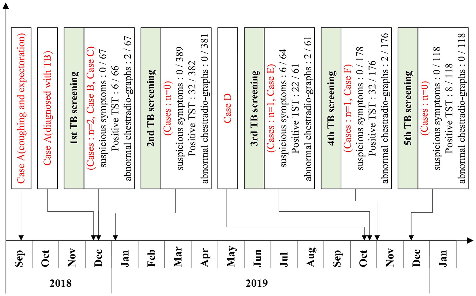 From December 2018, when the first case was diagnosed, to December 2019, a total of five screenings for TB among contacts were conducted (Table 2; Figure 3).