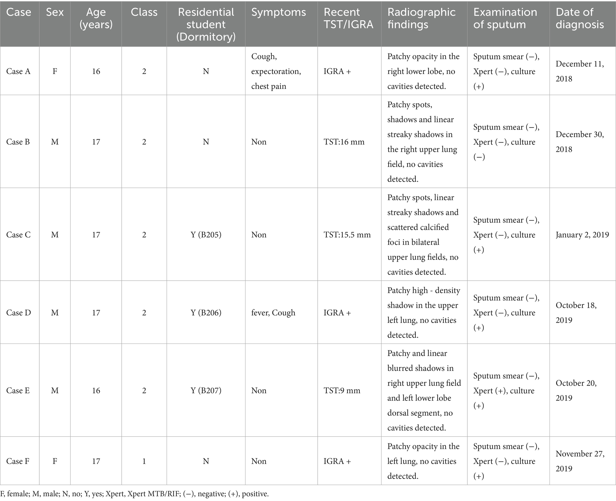 On December 11, 2018, a student in a high school in Shenzhen City, Guangdong province, China, was diagnosed as a TB case with positive sputum culture. We conducted a series of screenings and investigations into the outbreak at the school and have been monitoring it up to November 2024. Throughout the subsequent observation, five additional cases of TB were identified among the students in the patient’s class and the neighboring class. We retrospectively analyzed the survey data to analyze the characteristics and potential causes of this TB cluster outbreak and provide insights for timely identification and management.