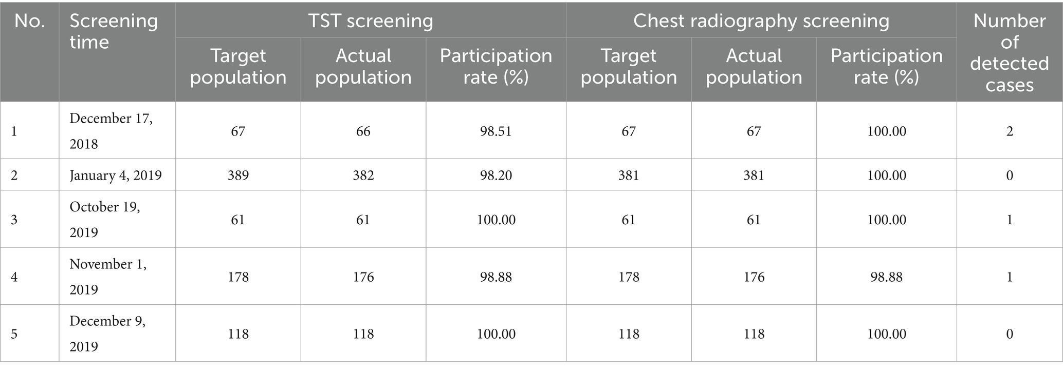 On December 9, the scope of screening was expanded again. 118 contacts in the class near the floor were screened. Both TST screening and chest radiography screening achieved full participation rates of 100%, and no TB was found.