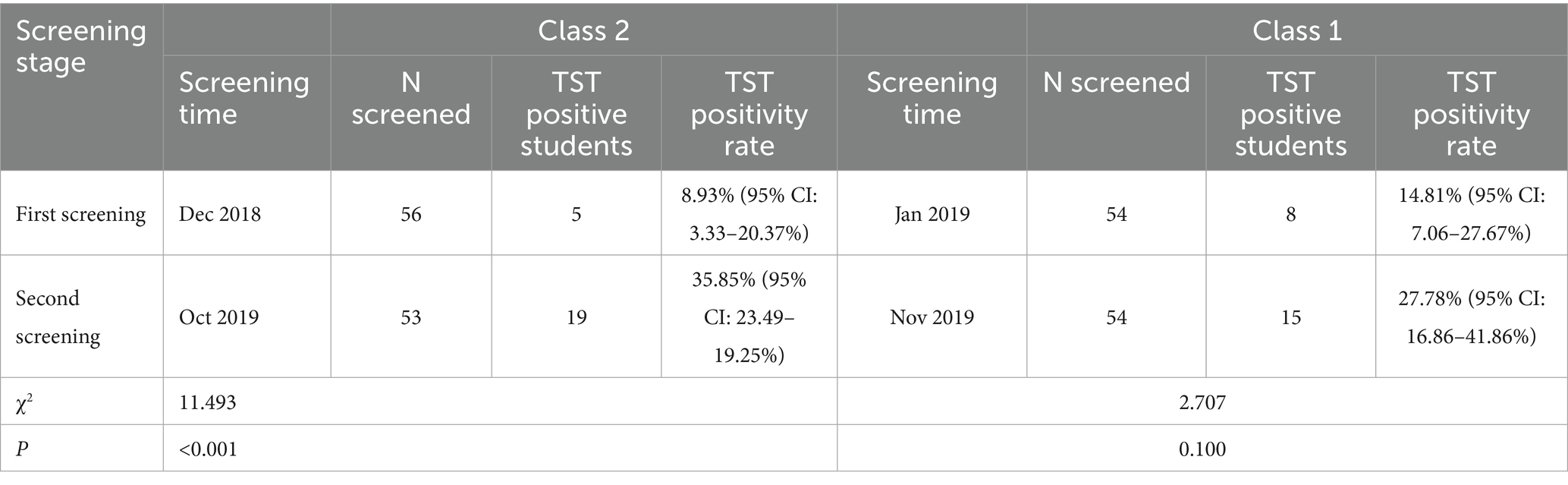 Statistical analyses were performed using the R (version 4.5.0) statistical software. The Chi-square test or Fisher’s exact test was employed, as appropriate, to analyze changes in TST positivity rates between the two screenings and differences in TB incidence rates between Class 1 and Class 2. Differences were declared significant for p-value < 0.05.