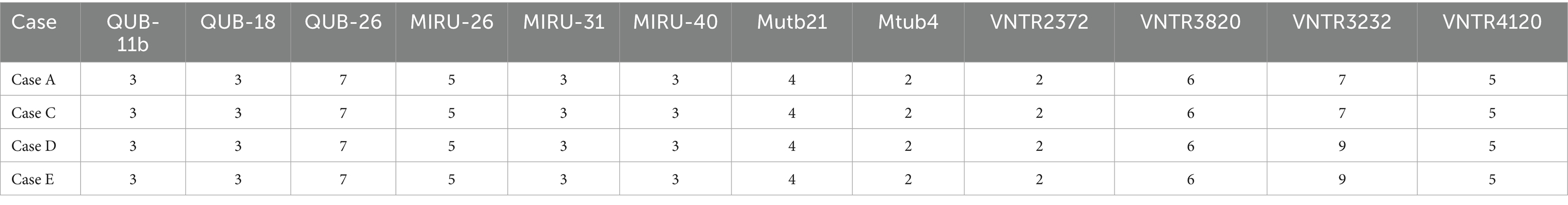 A total of five confirmed cases were reported during this outbreak, among which the sputum-positive culture specimen of one case (Case F) was not obtained. Only 4 cases (case A, C, D, and E) were genotyped by MIRU-VNTR typing. The results showed that all four strains belonged to non-Beijing genotypes. Cases A and C exhibited an identical genotype, and so did Cases D and E. Except for VNTR3232, the copy numbers of 11 loci were identical among Cases A, C, D, and E, indicating their belonging to the same transmission chain (Table 4).